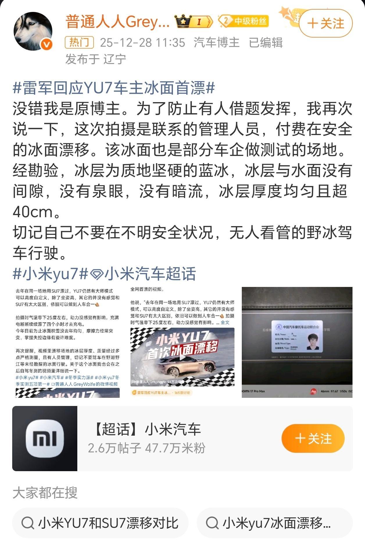 雷军回应YU7车主冰面首漂雷总只是善意的提醒一下注意安全!很多人借题发挥说小米YU7没有安全提醒?真服了这些老六!车主本人也回应了!为了防止有人借题发挥,这次拍摄是联系的管理人员,付费在安全的冰面漂移。该冰面也是部分车企做测试的场地。经勘验,冰层为质地坚硬的蓝冰,冰层与水面没有间隙,没有泉眼,没有暗流,冰层厚度均匀且超40cm。切记自己不要在不明安全状况,无人看管的野冰驾车!耍帅很过瘾,安全无小事!