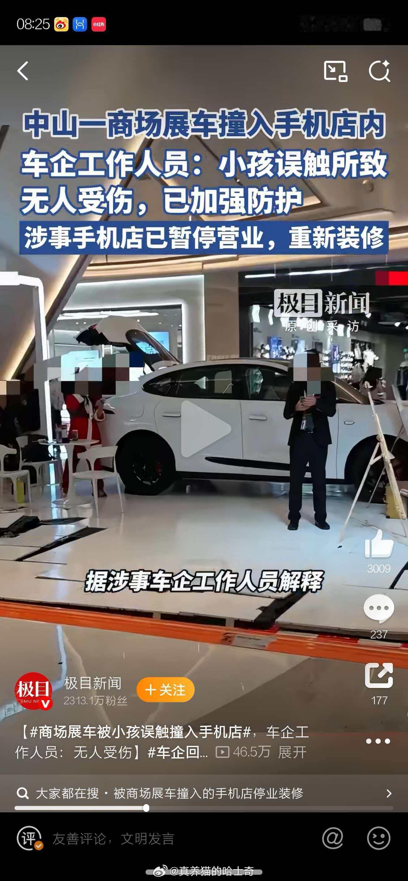 商场展车被小孩误触冲入手机店,手机店暂停营业要重新装修这个车没开展车模式吗?