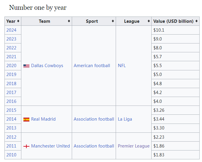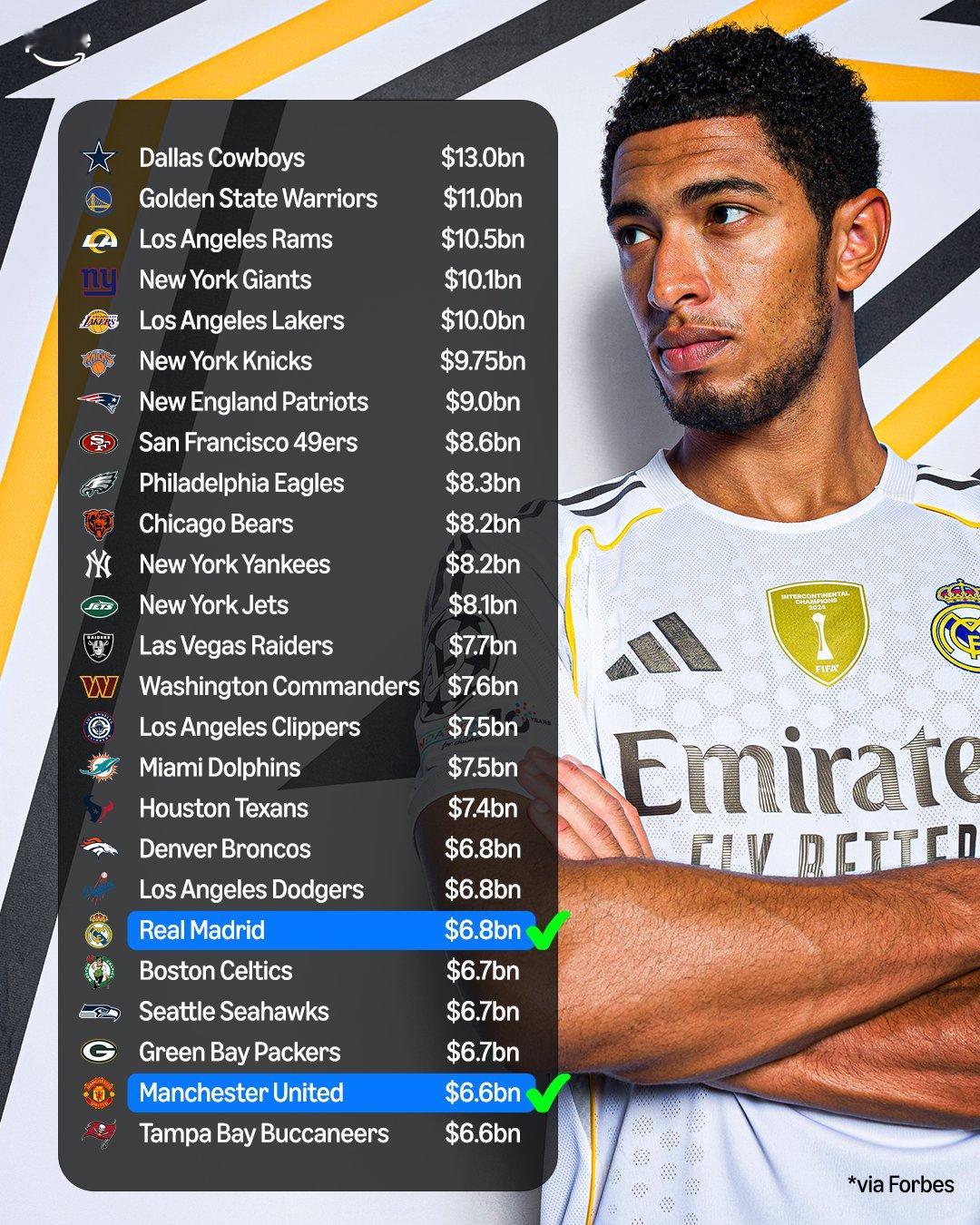 福布斯2025年全球最具价值体育团队榜单显示,前25名中仅有两支足球俱乐部上榜:皇家马德里(第20位,价值67.5亿美元)和曼联(第24位,价值66亿美元),其余均为美式橄榄球、篮球和棒球团队。该榜单基于团队收入、运营收入、市场价值和债务等因素计算,美国体育联盟主导前19位,凸显足球在全球影响力虽大,但在商业估值上仍落后于北美职业联赛。