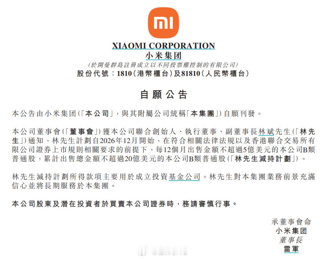 小米联合创始人拟减持不超20亿美元按照最新市值来看,林斌持有的股份价值超过100亿美元。看了一下,林斌计划是从2026年12月份开始,每12个月减持5亿美金,累计减持不超过20亿美金,一年后才开始呢?短期肯定有影响,但是长期肯定利好,一群专家又上线了