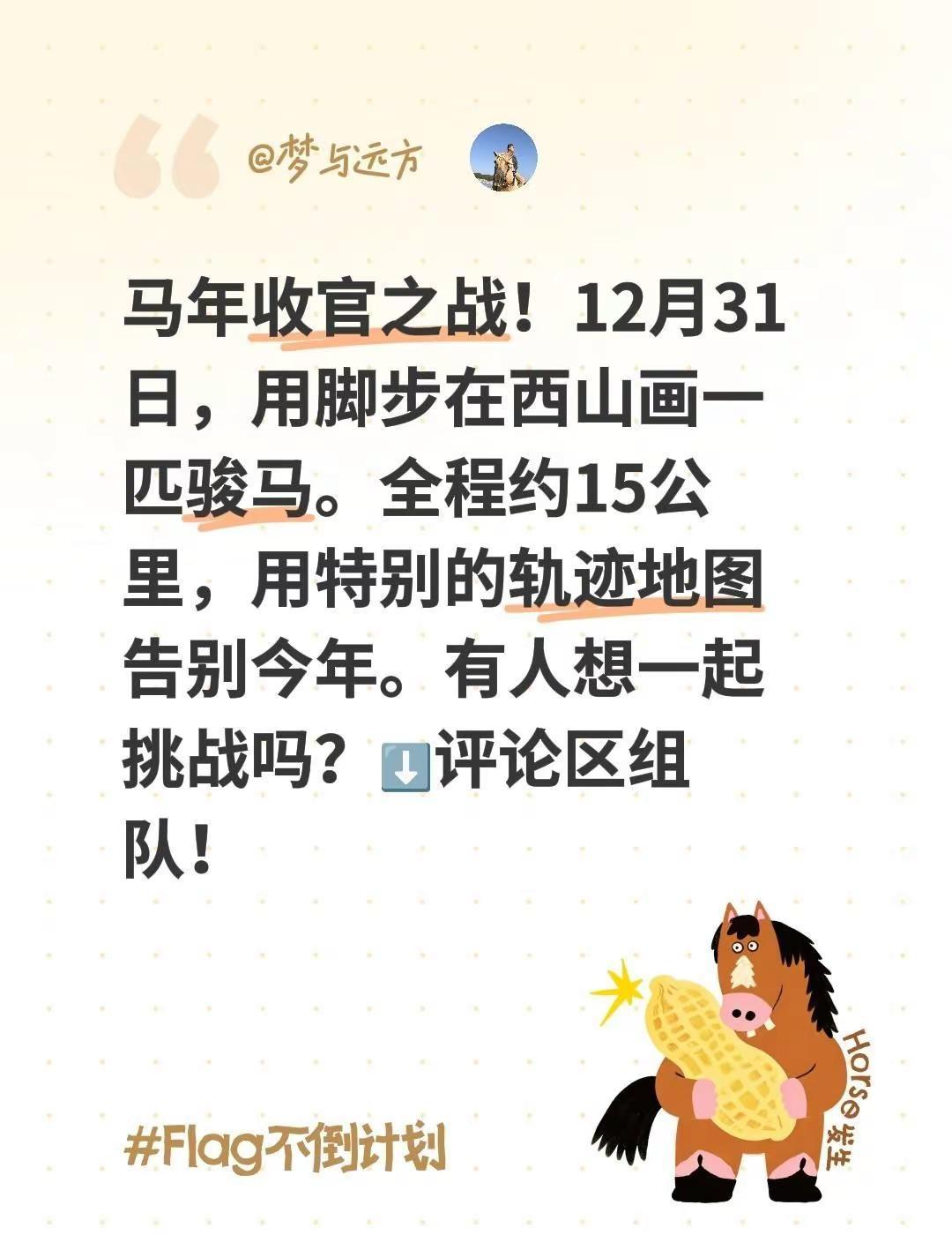 马年收官之战!12月31日,用脚步在西山画一匹骏马。全程约15公里,用特别的轨迹地图告别今年。有人想一起挑战吗?不重样的徒步方式 爬山徒步 找搭子 组队去旅行
