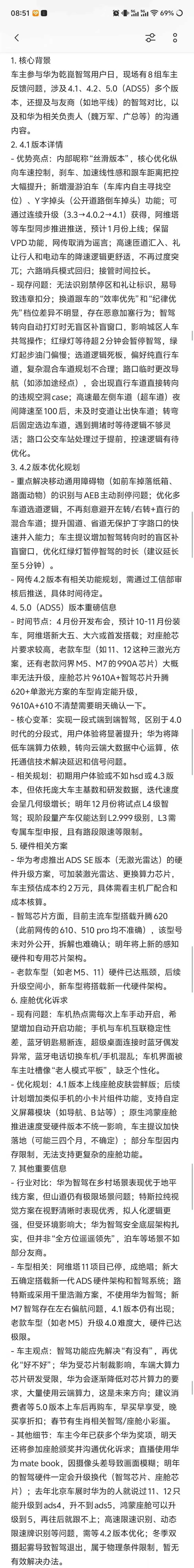 有车主参与华为乾崑智驾用户日整理了一大份资料 其中涉及OTA相关、智驾发展以及部分车型归宿。例如ADS5. 0讯息、阿维塔11成为绝唱、问界老M5硬件已经达到极限等。有些升级迭代的内容,越看泪水流的越多,感觉慢慢被时代淘汰!