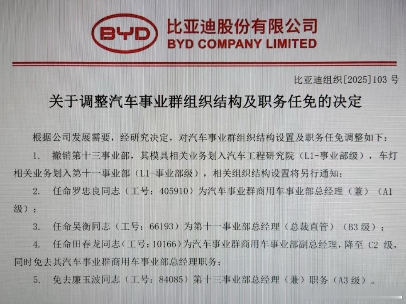 网传比亚迪内部做了组织架构的重大调整,撤销了13事业部,并重组合并 迪子明年要搞什么大动作么?