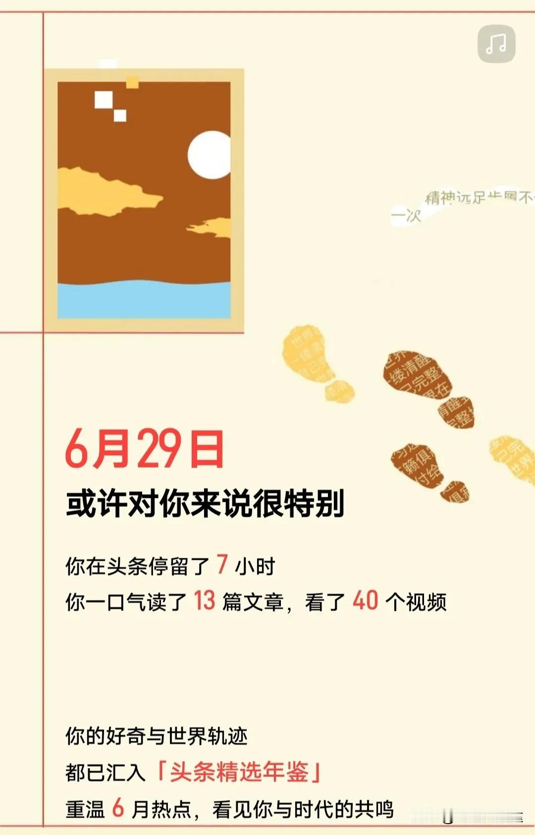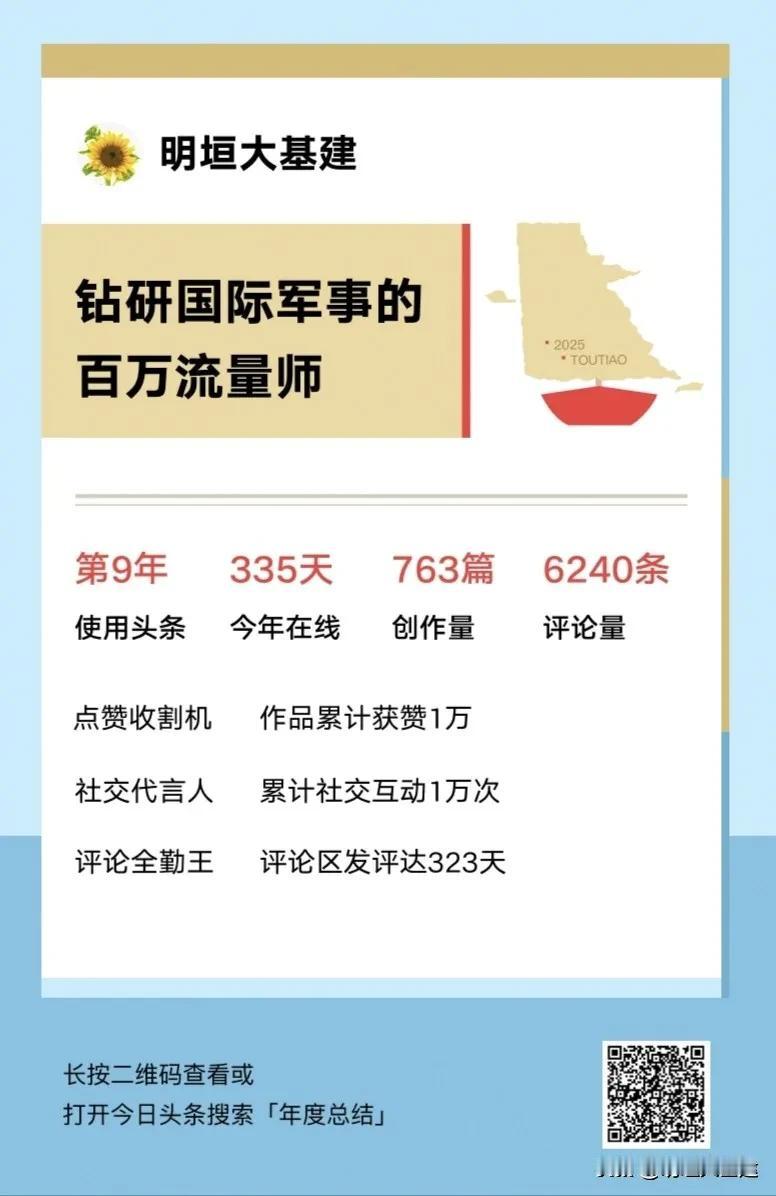 【2025头条年度报告】还是震撼到了我,真的是消遣了一番寂寞 啊[捂脸] 不知不觉间,又是一年岁末。今日头条送来的这份年报,静静躺在手机屏幕里——335个日夜,原来我们已彼此陪伴了这么久。 它像一个默契的老友,总在我等车的间隙、睡前的片刻悄然出现,用一条资讯、一段文字,将那些零碎的时光温柔填满。不知不觉中,那些滑动的页面,不仅消解了闲暇,更在我心里悄悄埋下了种子——从最初漫无目的地浏览,到后来主动探寻感兴趣的话题;从习惯性地阅读,到偶尔也试着写下自己的观点与感悟。指尖划过的,不再仅是消遣,更成为一种日常的沉淀。 感谢这份数字时代的陪伴,它让流逝的时光有了清晰的刻度,也让平凡的日子,在阅读与思考中生长出了新的枝桠。新年将至,期待继续与好内容为伴,在字里行间,遇见更广阔的世界,也遇见更丰盈的自己。世界,也遇见更丰盈的自己。 更感谢师友们的热情和支持,点一个赞是缘分,点十个赞是感情,点无数个赞就是恩情!也正是这种线上的力量,才有这部分群体价值取向的凝聚与共鸣——在虚拟空间里,每一份鼓励都像真实的灯火,照亮彼此前行的方向;每一次互动都在无形中构筑起信任的基石,让散落的个体逐渐凝结成一片温暖而坚韧的土壤。我们在这里收获的不仅是知识和经验,更是一种“被看见、被认同”的精神支撑。这份源于屏幕之外却深入人心的情谊,正悄然塑造着我们共同的认同:以真诚回应真诚,以成长回报陪伴,在数字时代的浪潮中,守护着一份纯粹而向上的联结。