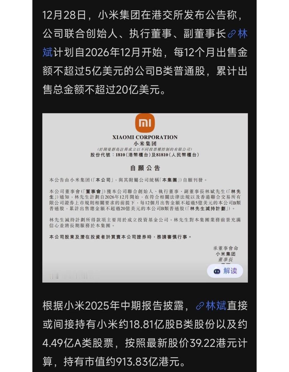 小米联合创始人、副董事长林斌减持20亿美元股票,对股民来说这是好事。历史就是这样告诉我们的? 林斌历史上有三次大规模的减持,最后都是以股票大涨收尾: 第一次,2019年减持3.7亿,半个月下跌10%,随后三个月上涨50%。 第二次,2020年9月减持79亿,一个月下跌10%左右,后续三个月大涨70%。第3次,2024年减持1.8亿,后续三个月股价进入主升浪。 …… 小米股票近几个月的表现一直萎靡不振,或许此次林斌计划减持的这个消息对小米股票会起到反向刺激作用,毕竟大股东总不希望自己的股票是在低位减持! 大家觉得今天小米股价是低开还是高开,能不能重新上40?