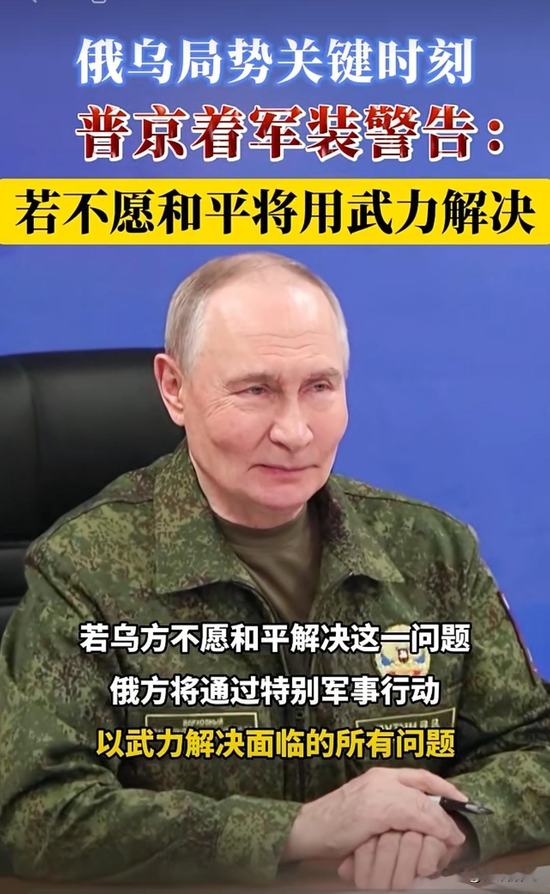普京罕见着军装向乌克兰发出最严厉的警告: 若不愿和平将用武力解决! 俄乌战争真是一波三折,许多人都以为就要“和平”了,结果还是一场虚幻,美西方主导的“20点和平方案”之所以再度搁浅,其核心原因主要集中在“领土主权与安全保障”两大核心议题上。 乌克兰拒绝承认俄控克里米亚及乌东四州,还要求俄从第聂伯罗彼得罗夫斯克等四州撤军 ;俄坚持对上述地区的既得利益与主权,拒绝撤出并要求乌方法律或事实让步,这是双方不可逾越的底线。 乌克兰要“类北约”安全承诺、保留80万兵力,不放弃入约路径 ;俄则坚持乌去军事化、限军、永久中立且永不入约,视“类北约保障”为变相入约,触碰其开战核心诉求(阻止北约东扩)。 双方这两个核心的东西没谈拢,而且互不相让,我看这俄乌战争还要干下去,而且俄罗斯可能会改变以往瞻前顾后的保守作战方式,战争可能会更加惨烈…