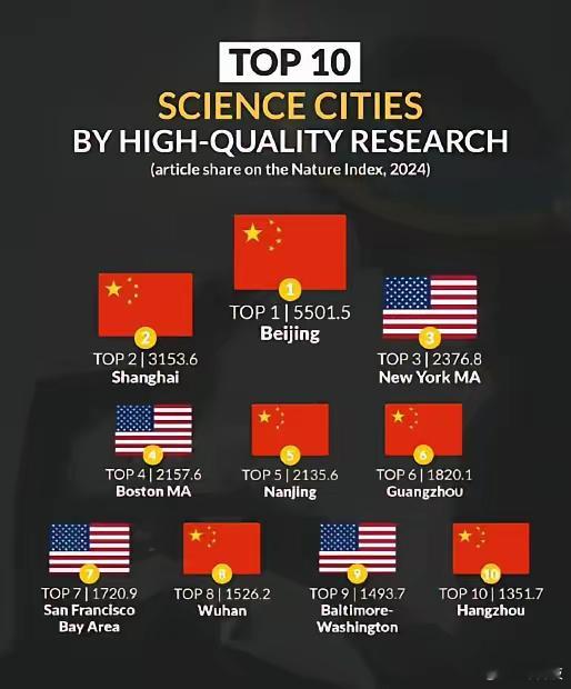 全球十大科研城市,中在美国和中国——中国占了六席,美国占四席,甚至前两名居然都是中国城市。