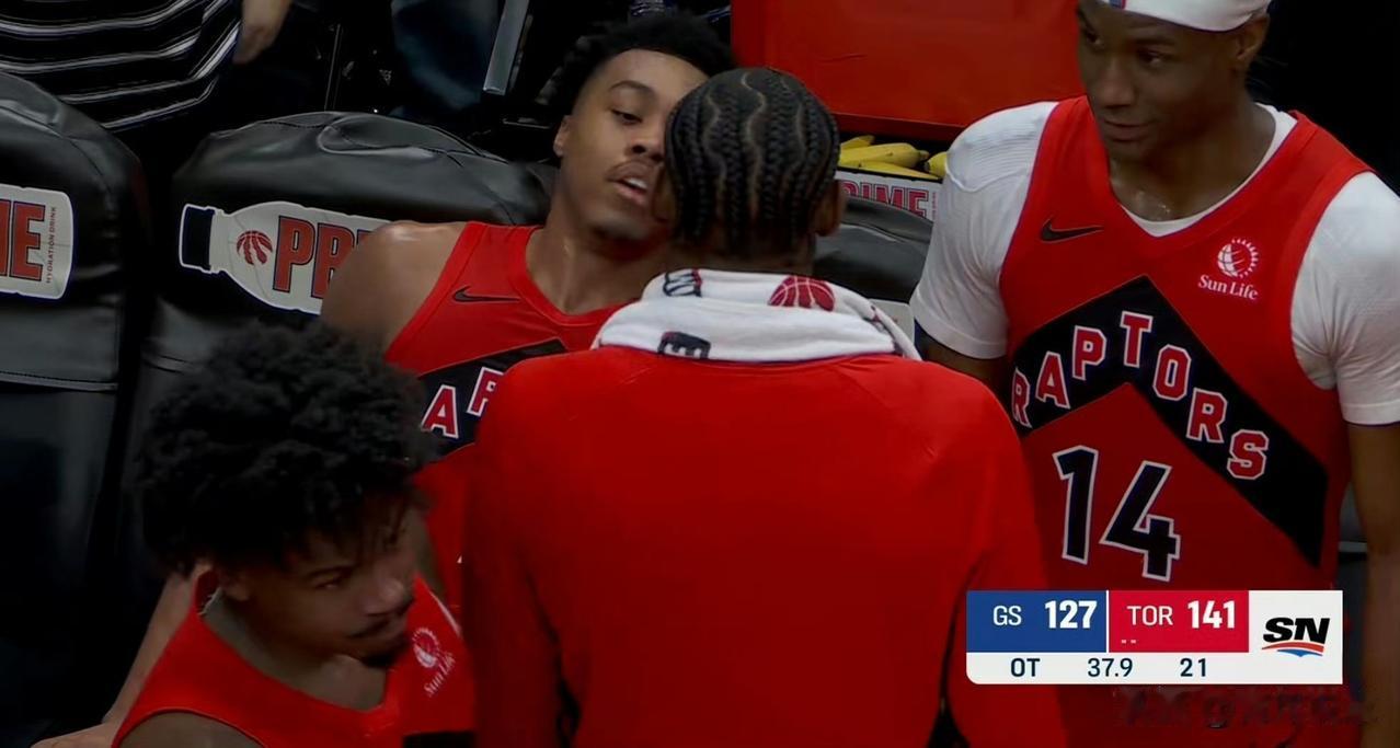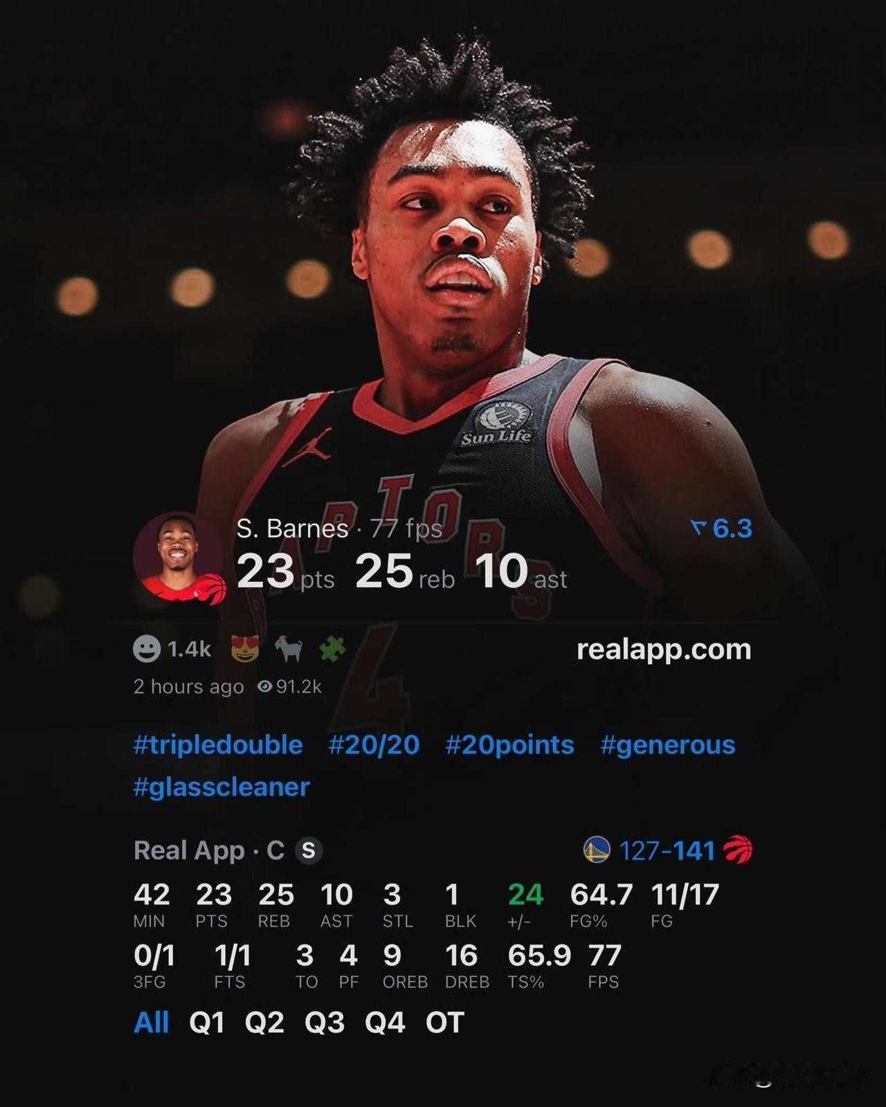 直接瘫倒!真给巴恩斯累坏了! 今天,主场作战的猛龙队以141-127逆转战胜勇士队,终结了对手的三连胜。 本场比赛,猛龙队凭借身高尺寸优势在第四节追上了比分,双方进入加时赛。加时赛更是成为了巴恩斯的前场篮板表演时刻,他连续抢下了4个前场篮板,带领球队在加时赛打出19-5的致胜比分,最终帮助球队赢下了比赛。 全场比赛,巴恩斯得到23分25篮板10助攻的三双数据,成为猛龙队史首位20+20+10的球员。胜局已定时,巴恩斯终于被换下,他累得直接瘫倒在了替补席,为了带队赢球,他已经拼尽了全力。