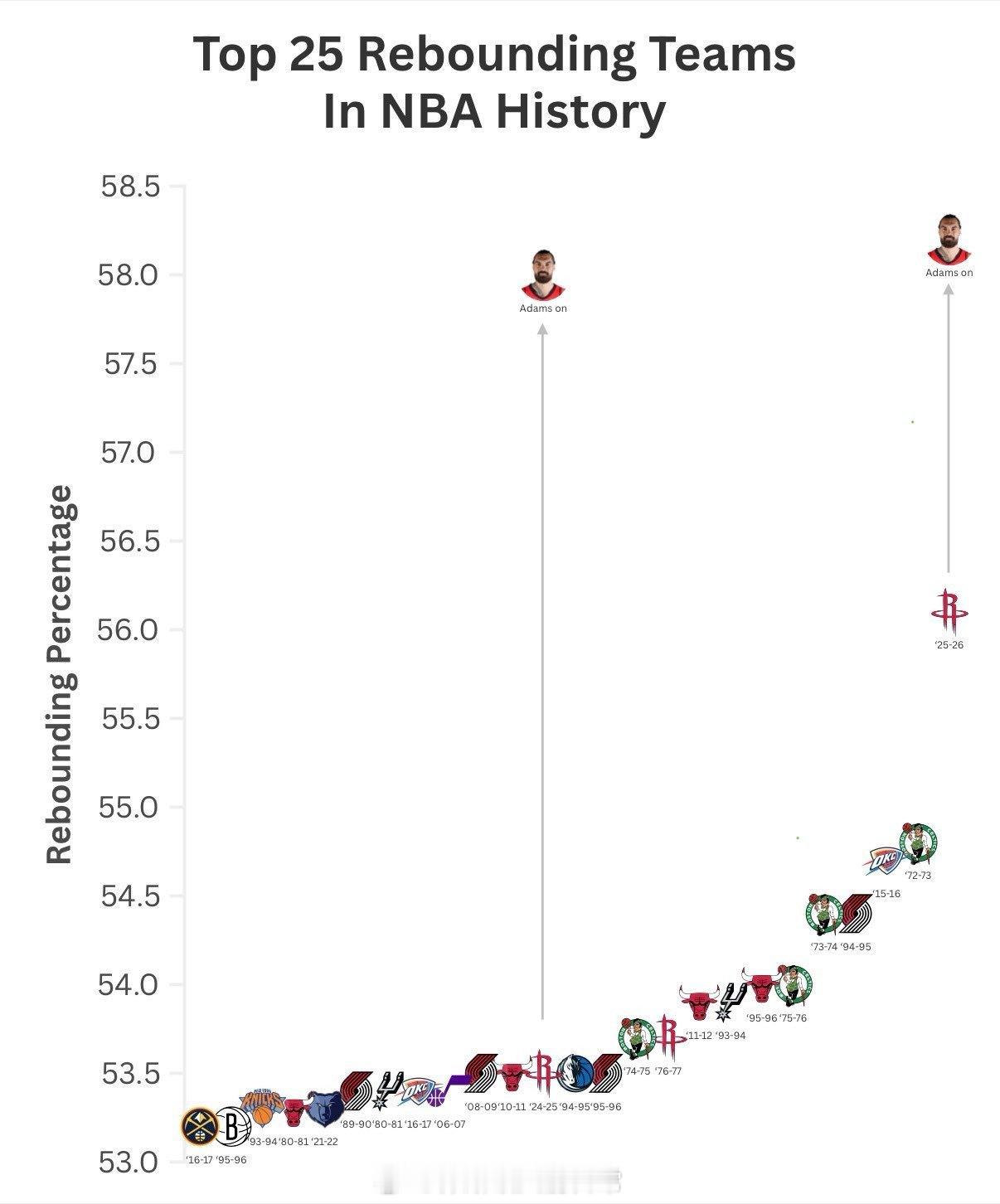 按总篮板百分比计算,本赛季NBA前5名篮板三人组阵容......1.亚当斯 - 小贾 - 杜兰特 | 61.6%2.亚当斯 - 小贾 - 谢波德 | 61.4%3.亚当斯 - 小贾 - 阿门 | 59.5%4.亚当斯 - 杜兰特 - 谢波德 | 58.7%5.亚当斯 - 杜兰特 - 阿门 | 58.5%我们从未见过像亚当斯在2025-26赛季那样,在球队篮板数据上统治联盟的球员。休斯顿火箭篮球年末狂欢季新赛季篮不住