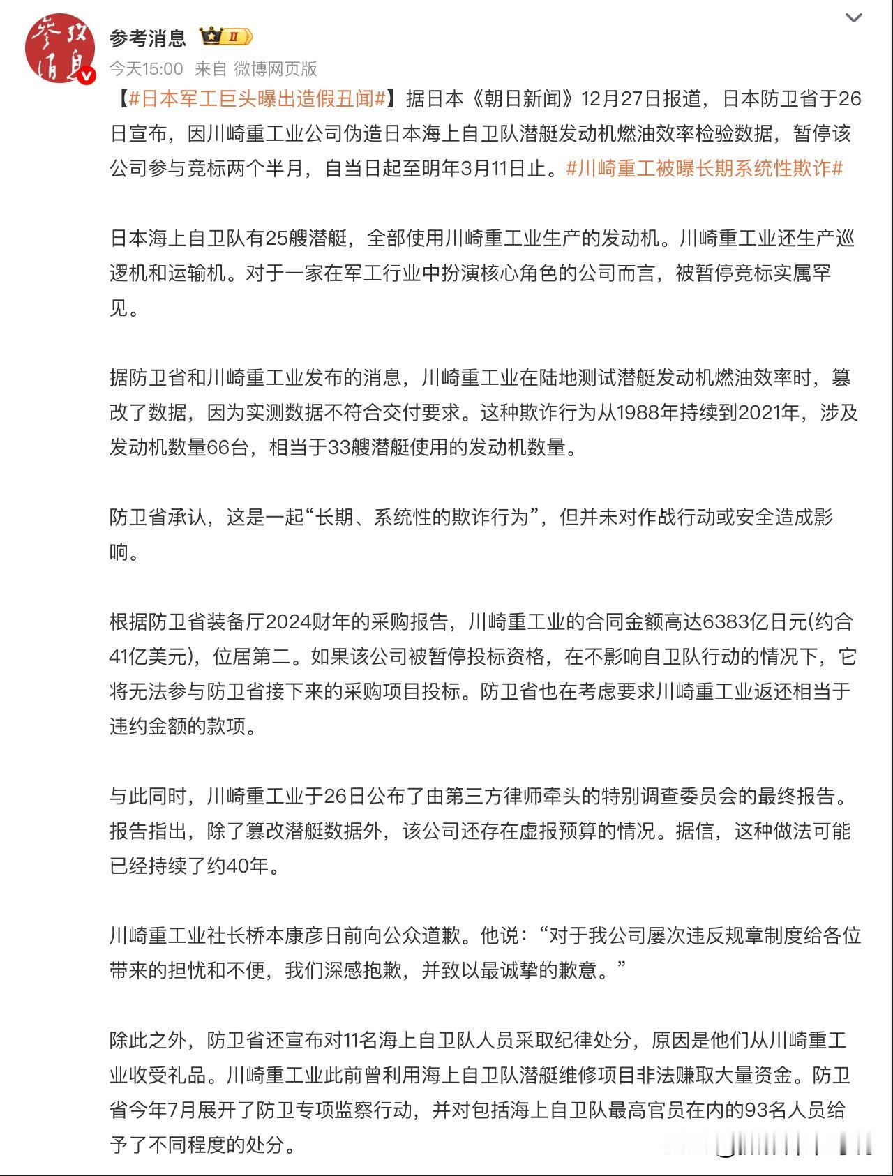 日本军工巨头又发挥祖传躬匠精神了,原因嘛还是因为数据造假。没错,这家军工企业就是川崎重工,它伪造了日本海上自卫队潜艇发动机燃油效率检验的相关数据。据调查,这是一场长达30多年的长期、系统性的欺诈行为。而最终的处罚结果只是暂停该公司参与竞标两个半月,外加鞠躬道歉!对于一家有着悠久历史的大公司而言,这种处罚可以说是接近于无了吧!不过我个人倒是蛮喜欢这种处罚的,简单而不粗暴,下次还可以继续嚯嚯!冬日生活打卡季