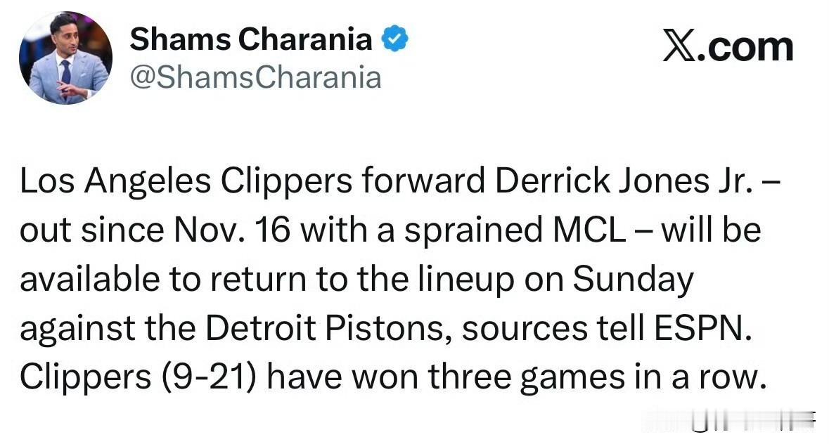 快船北伐开始了!!!小德里克-琼斯复出战活塞! 根据记者Shams最新消息透露