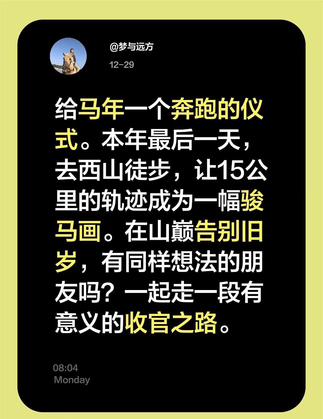 给马年一个奔跑的仪式。本年最后一天,去西山徒步,让15公里的轨迹成为一幅骏马画。在山巅告别旧岁,有同样想法的朋友吗?一起走一段有意义的收官之路。徒步爬山 不重样的徒步方式 登山徒步 北京徒步
