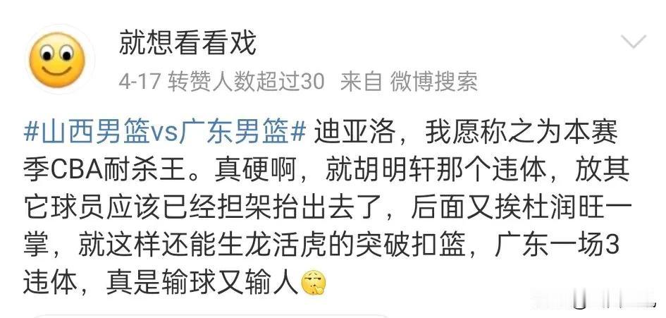 迪亚洛就不是一个省油的灯! 昨天晋粤大战后,迪亚洛又冲上了风口浪尖。广东球迷火力全开原因有三:其一突破时放倒陈家政,其二防守时伸腿绊倒陈家政,其三在争夺后场篮板时击中了陈家政的脸部。广东球迷自认为,迪亚洛就该被判罚三次违体犯规,裁判仅给迪亚洛一次普通犯规,所以群情激愤,义愤填膺,甚至咒山西“矿难”。而对王少杰故意肘击迪亚洛的事情,却选择性失忆避而不谈。 山西球迷权且搁置王少杰肘击迪亚洛的问题,只讨论迪亚洛那些对抗动作力度,只要对抗就有人倒地?迪亚洛怎么也想不明白,上赛季张浩嘉、杜润旺、胡明轩一场比赛,轮番三次违体犯规收拾自己,都没有一碰就倒地。如果迪亚洛这么想,那么格局可就真是小的没说了。迪亚洛应该忘记前嫌,面向未来。老球员应该给迪亚洛上点思想教育课,学习一下杜指导被查尔斯一拳干成脑震荡,却不计前嫌依然风轻云淡的胸怀;学习一下哪位大哥不搞性别歧视,遇事选择沉默回避的高雅;学习一下什么中锋被指涉嫌赌球被国家队剔出去后,依然挚爱篮球的情怀;学习一下吉伦沃特嗑药后,一笑而过转身离开的潇洒。迪亚洛遇到红灯不绕行就知道死干,但是你干不过对手。有记者披露:在广东对阵山西的比赛中,裁判回放过程中,甚至听到场边指导提及“要不就不犯,要犯就要狠”。面对迪亚洛这样的对手,似乎只能用更狠的方式回应,王少杰的做法让不少人暗自称道。 迪亚洛明白不?学不会克制自己,就真成了不省油的灯了。再不收敛,被干坏的人就是你,富兰克林就是你的版本?