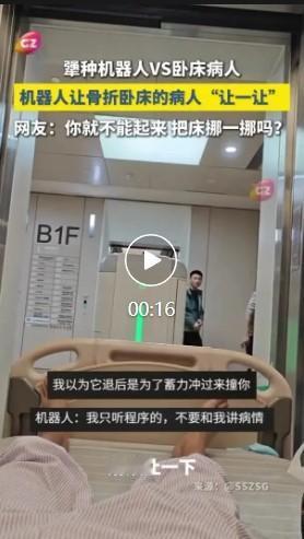 “我正在进入电梯,麻烦让一让”,医院物流机器人准备进入电梯,让躺在病床上的骨折病人让一让。网友:挺好的,不用担心被替代了。 网友评论“挺好的,不用担心被替代了”,是借医院物流机器人让骨折病人让行的细节,打消了对“智能设备完全替代人类”的担忧,本质是认可“人机协同而非对立”。 此前大众对智能设备的普遍焦虑,源于担心技术会强势挤占人类工作、忽略人类特殊需求。但此次场景中,机器人对行动不便的骨折病人发出“麻烦让一让”的提示,更像是礼貌询问而非强制要求,还暴露了其局限——无法自主判断特殊场景优先级,没意识到病人难以轻易让行,仍需人类协助协调。 网友的释然是“需人文判断、柔性协调的场景,仍是人类核心价值所在”,机器人可完成配送物资等标准化任务,但面对“病人能否让行”“电梯内顺序协调”等非标准化场景,离不开人类介入。这种“略显笨拙”的礼貌提示,明确了机器人的定位是“辅助工具”,而非替代者。 这句评论是轻松的调侃式释然:原本担心“机器人越智能越会抢工作”,但看到其在特殊场景中的局限后,网友认清人类的共情与变通能力是智能设备暂无法替代的,进而放下了被替代的焦虑。