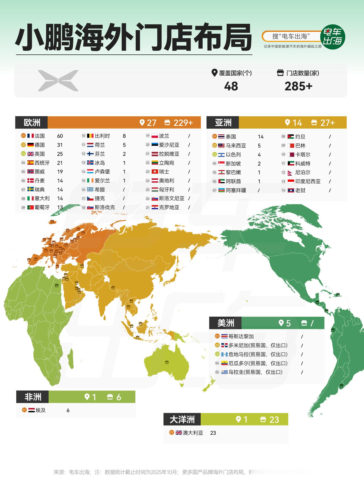【小鹏海外门店布局】暂别欧洲后,小鹏重返海外高端市场,渠道布局成效也逐渐显现。截止10月,小鹏的海外门店已覆盖全球48个国家和地区,总数增至285个。欧洲依然是布局的核心,229家门店占据了八成以上,核心国家布局持续加密,法国已落地60家门店,德国网点达31家,即便是爱尔兰、丹麦、挪威这些对车极其挑剔的西欧市场,小鹏也完成了渠道覆盖。并且,随着奥地利麦格纳工厂与慕尼黑研发中心的启用,小鹏欧洲门店的交付、售后和技术适配能力也将大幅提升,进一步巩固欧洲市场的基础。亚太市场,小鹏没有“广撒网”,而是聚焦东南亚等潜力区域,在“新马泰”共铺开21家门店;虽部分新兴市场门店密度仍有提升空间,但先在核心区站稳脚跟,方便后续针对性跟进服务和本地化配套。更关键的是,这些门店不只是“卖车柜台”,小鹏把 XNGP 智驾系统做了海外适配,针对欧洲环岛、东南亚摩托车密集的场景优化算法,成了海外用户智能体验的线下入口;充电基建也没落下,一口气把充电网络铺进30多国,接入了超过 246 万根充电桩。这种 “先攻高价值市场、用高科技深度绑定用户、 用生态建设长期留存” 的打法,比 “广撒网” 实在多了,这种扎实的出海范式,也为中国汽车品牌的全球化提供了更具长远价值的思考,值得我们持续关注。大v聊车电车出海小鹏汽车