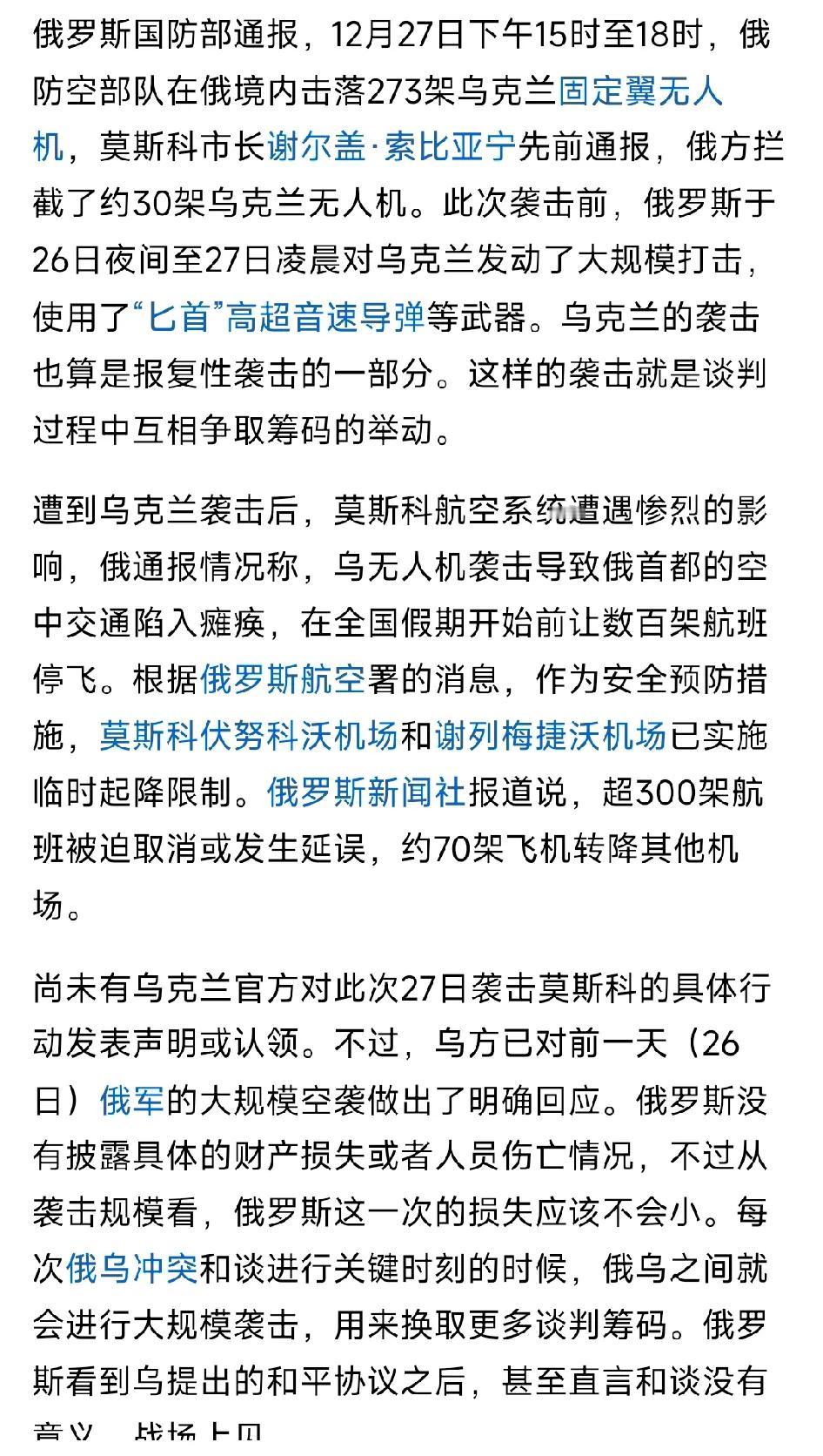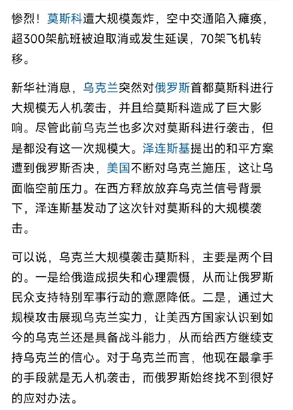 ​乌克兰突然对俄罗斯首都莫斯科进行大规模无人机袭击,并且给莫斯科造成了巨大影响。