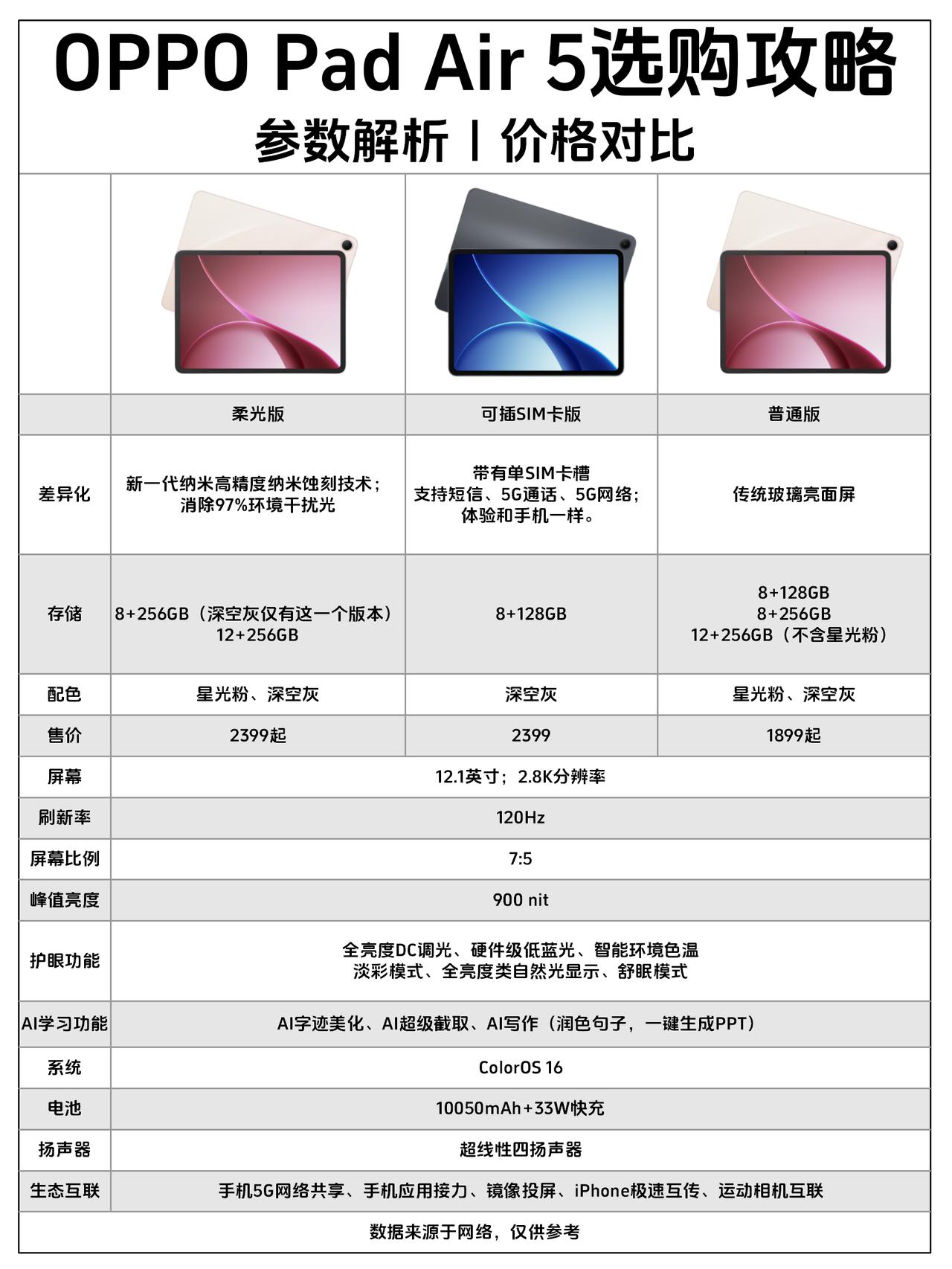 OPPO Pad Air5居然有三个版本,该咋选? 刚发布的OPPO Pad Air5分了三个版本,这么细的,估计不少人还没整明白吧? 整理了下这三款的配置,感觉分的还是挺合理的,大家按照自己的需求来选还挺划算的 普通版本就是最基础的,主打的就是一个划算,1899起性价比到位了其它都好说。 柔光版主要是屏幕换成了柔光屏,据说是用了新技术,既有柔光效果,还不会影响清晰度,比类纸膜强不止一档。 插卡版就是增加了个SIM卡槽,插卡后基本跟手机一样,能上网能打电话的 感觉这代OPPO Pad Air5还挺有诚意的啊,外观更清新高质感了,配置也都升级了,各版本分开也方便大家按预算喜好来选,最近首销能带国补,感觉还挺适合学生党入手的