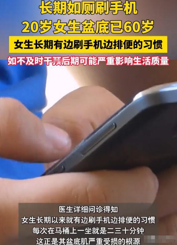 浙江宁波,一名20岁女生排便时总感觉肛门疼痛,本以为是得了痔疮,可去了医院检查,却被告知并没有痔疮,刚想松一口气,医生又告知:盆底功能下降,甚至不如很多老年人,这让人有点意外,年轻人怎么可能出现这种状况?医生仔细问诊才发现,这和她平时上厕所玩手机的习惯脱不了关系。 原来,女生每次上厕所都至少二三十分钟打底,总是坐在马桶上刷着手机就忘记了时间,有时候明明已经排完便了,还舍不得起来,非要多蹲一会儿。 可盆底肌就像一张“吊床”,专门支撑着盆腔里的器官,长时间蹲在马桶上,这张“吊床”就会一直被压着,时间长了就会慢性损伤,变得松弛无力。 大家可别觉得“吊床松了”是小事,盆底肌松弛之后,肛门括约肌也会跟着松,肛门关不紧,肠液就会渗出来刺激肛周皮肤,让皮肤变脆、开裂,这就是姑娘肛门疼、出血的原因。 要是不及时改习惯、治疗,以后还可能出现肛门潮湿、控不住大便的情况,想想都觉得影响生活质量。更吓人的是,最近几年像这样的年轻患者越来越多,都是长时间上厕所玩手机闹的。 可能有人会说,“我上厕所不玩手机就拉不出来,蹲久点咋了?” 这真不是小事!如厕时玩手机的人,蹲坑时间超过5分钟的概率是不玩手机的5倍,而蹲坑时间一长,得痔疮的风险会增加46%。 这还只是开始,有人上厕所刷手机蹲了2个小时,结果肠子直接掉出来13厘米,诊断为最严重的三度脱肛,以后用力咳嗽都可能让肠子掉出来。 除了伤盆底、掉肠子,长时间蹲厕所玩手机还有俩隐藏危害,脑供血不足:不管是坐马桶还是蹲便,时间长了血液都往下流,脑部供血不够,血压一升高,很容易诱发心梗、脑中风。 容易沾细菌:厕所里全是大肠杆菌、霉菌这些致病菌,手机拿进去很容易沾染上,再拿手机吃饭、摸脸,很容易生病。 现在很多人都有“厕所沉迷症”,把厕所当成了“放松区”,觉得上厕所不玩手机就是浪费时间。但为了多刷几分钟视频,把自己的身体搞坏了,值得吗?对普通人来说,健康才是最值钱的,上厕所就该速战速决。 医生认可的排便习惯有:上厕所坚决不带手机,把手机放在卫生间外面,强迫自己专心排便,时间控制在3-5分钟内,最多不能超过10分钟。平时多做提肛运动,早中晚各收缩肛门100次,锻炼盆底肌,增强肌肉力量。 饮食上多吃点易消化、含膳食纤维的食物,少喝奶茶、吃辣的,避免便秘,毕竟便秘了就更容易蹲久了。 宁波这姑娘的案例就是个警钟,别觉得年轻就可以随便造,身体的损伤都是慢慢积累的,等真出问题了再后悔就晚了。现在很多年轻人的身体,还不如老一辈注重保养的人结实,就是因为这些不好的小习惯。 那些上厕所离不开手机的人,还是早点改掉这个坏习惯吧! (每天更新,欢迎关注,喜欢文章的可以帮忙点个赞留条评~) 对此大家有什么看法?