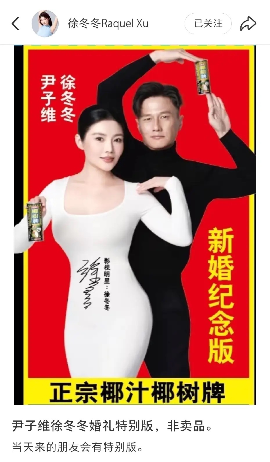 徐冬冬晒出婚礼特别版饮料,只在她们哈尔滨婚礼上供应,这就是椰汁女神独有的排面嘛!哈哈,太有面子了