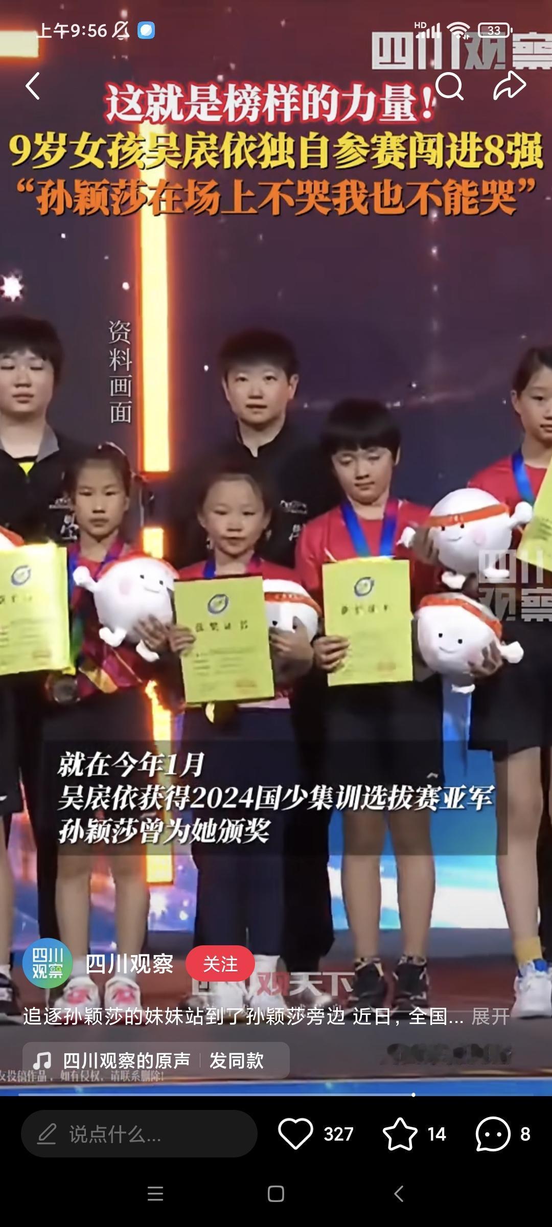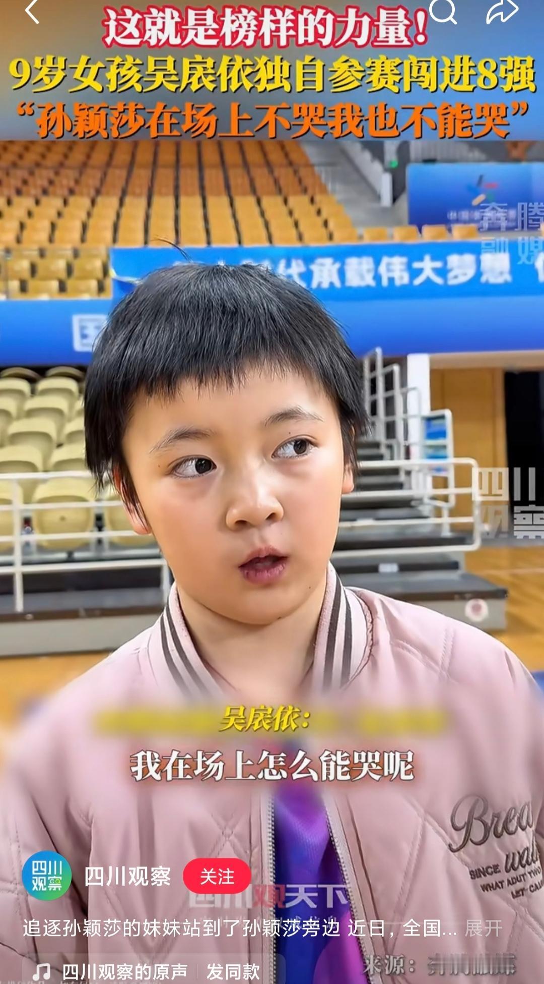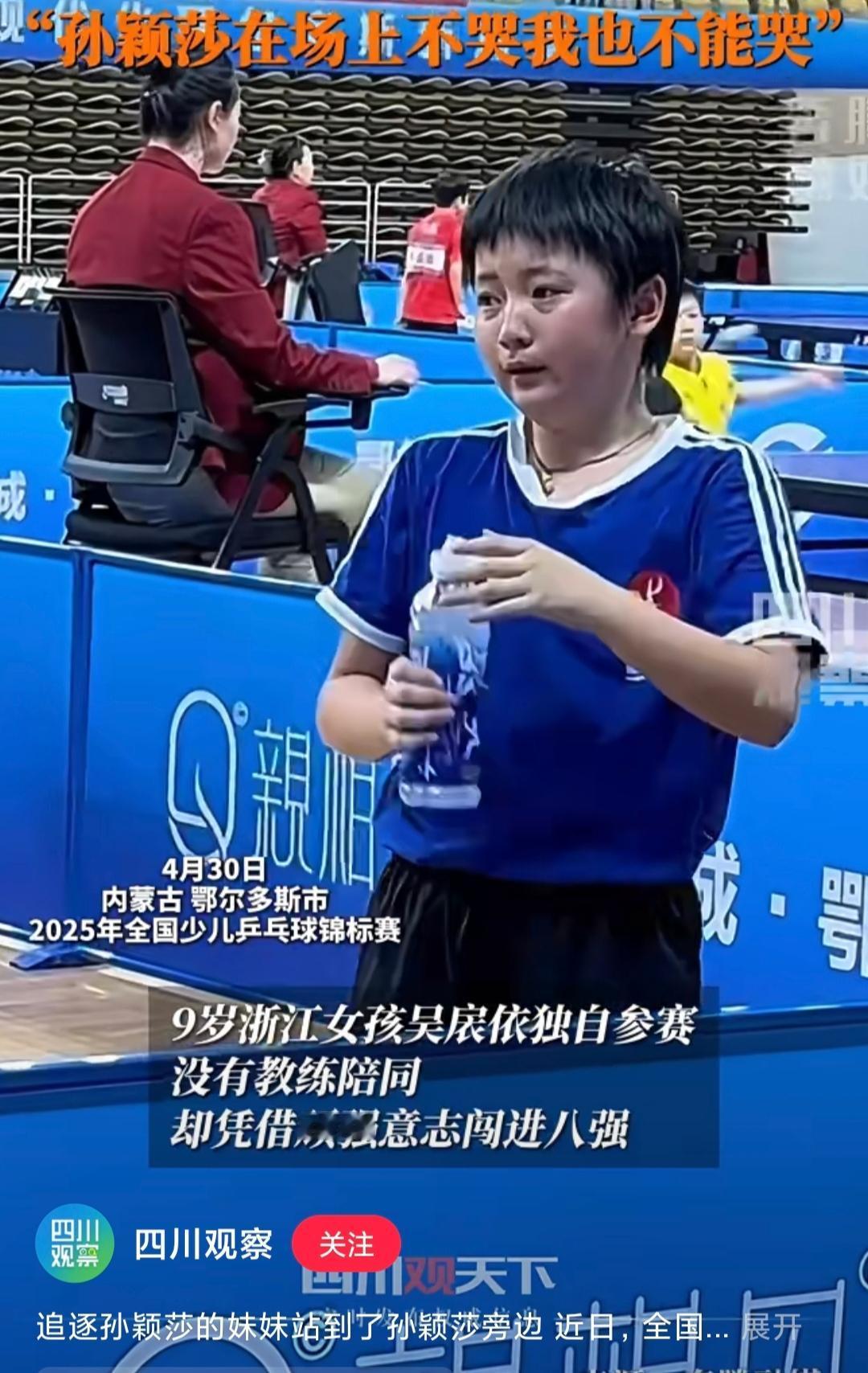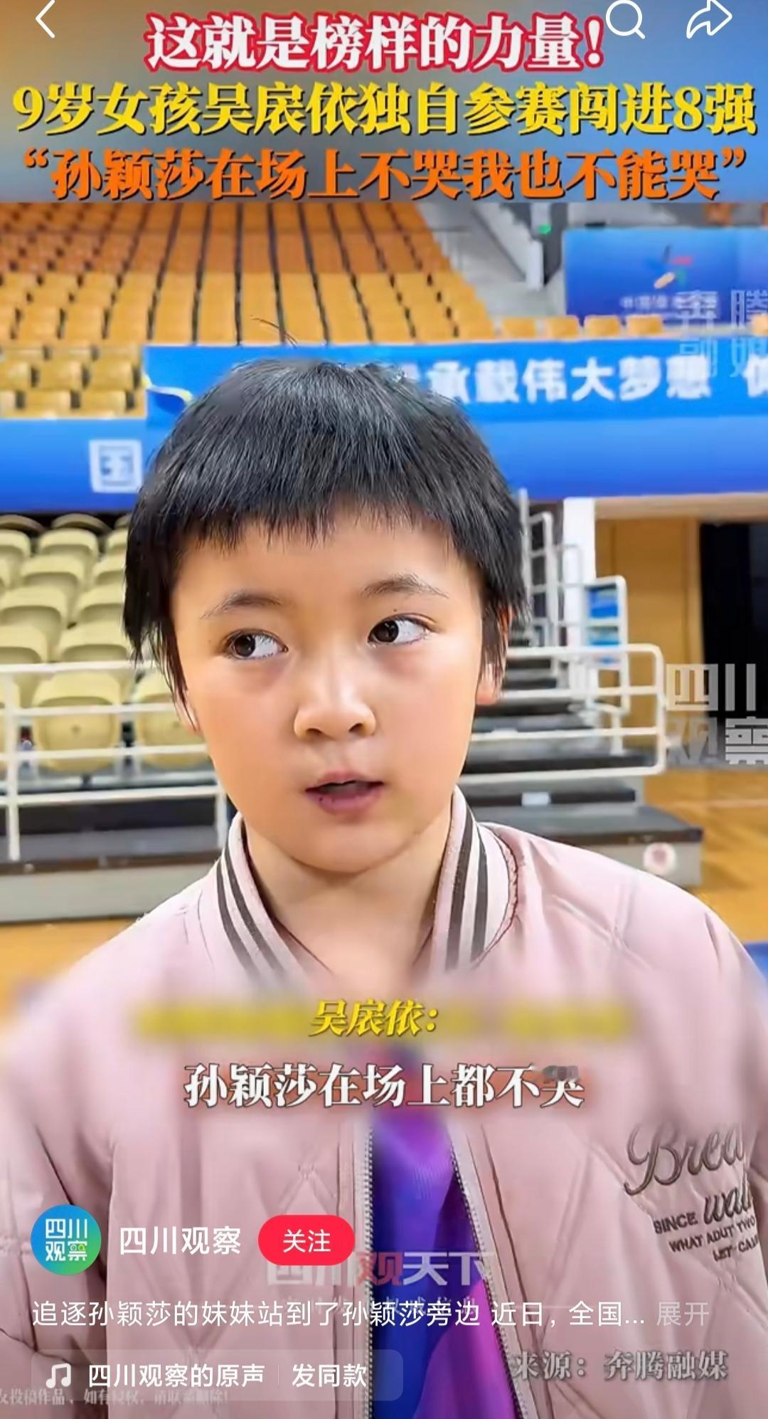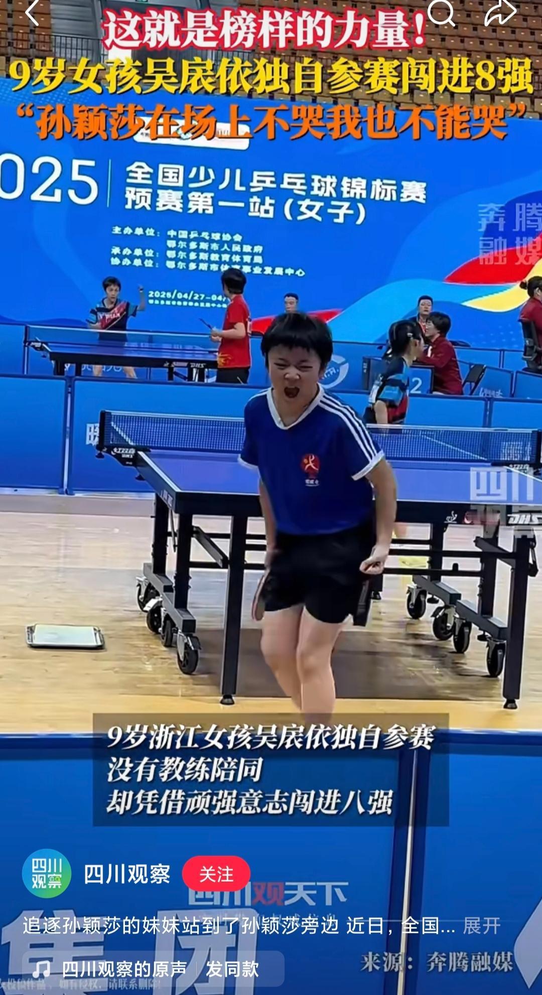 这小孩有望成为孙颖莎的接班人。 莎莎的精神鼓励了很多人,其中就有以她为榜样的吴扆婷,小女孩留着短短的头发,两眼炯炯有神。去年莎莎还给她颁奖。 小女孩一个人参加比赛,没有教练陪同,勇闯8强。有人问她害怕吗?她说:“不怕,莎莎姐姐都没有放弃,我也不能放弃,她不都没哭,我也不哭。” 和莎莎来时路好像,希望她未来越走越宽广。