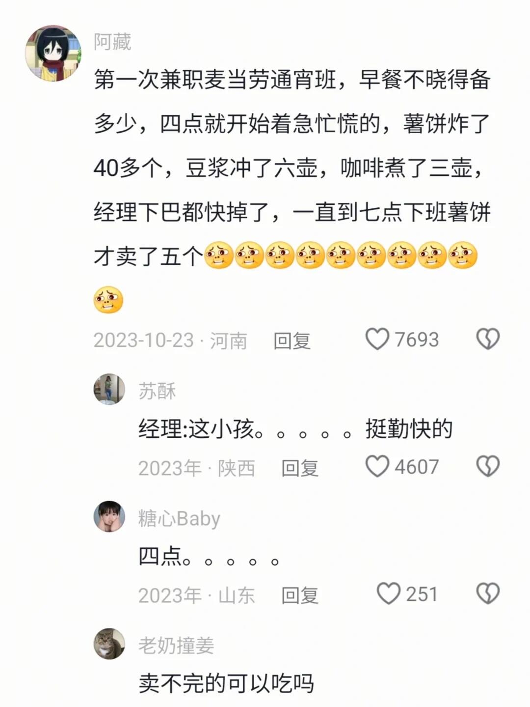 第一次兼职麦当劳通宵班,早餐不晓得备多少,四点就开始着急忙慌的,薯饼炸了40多个,豆浆冲了六壶,咖啡煮了三壶,经理下巴都快掉了,一直到七点下班薯饼才卖了五个