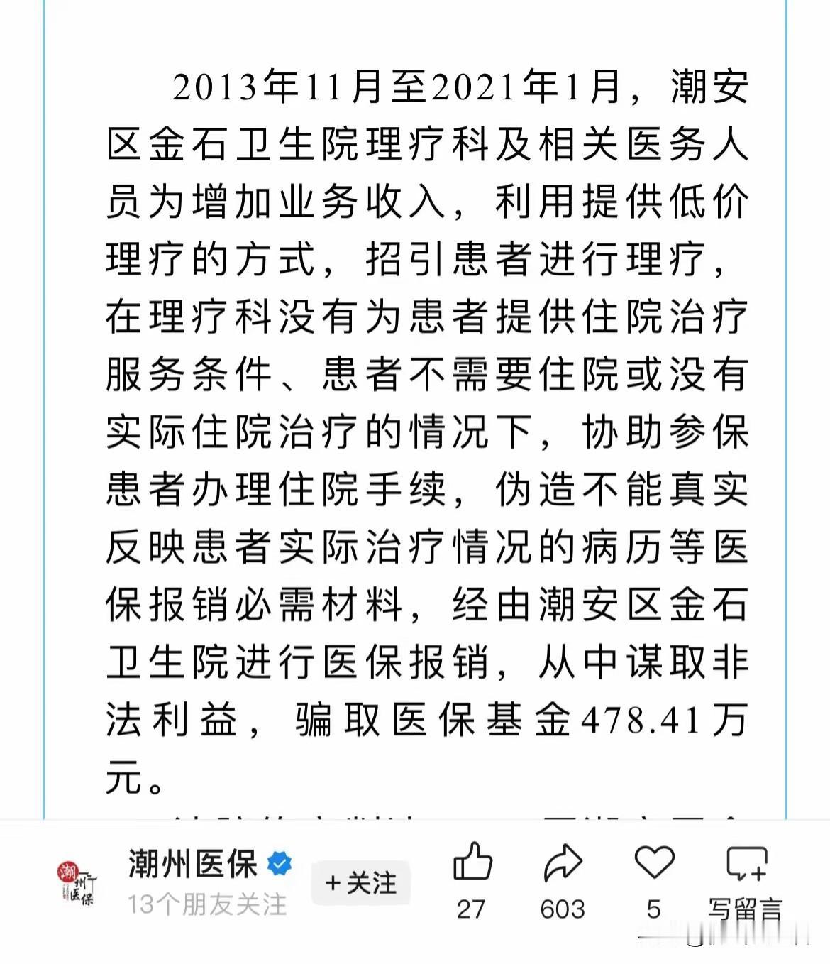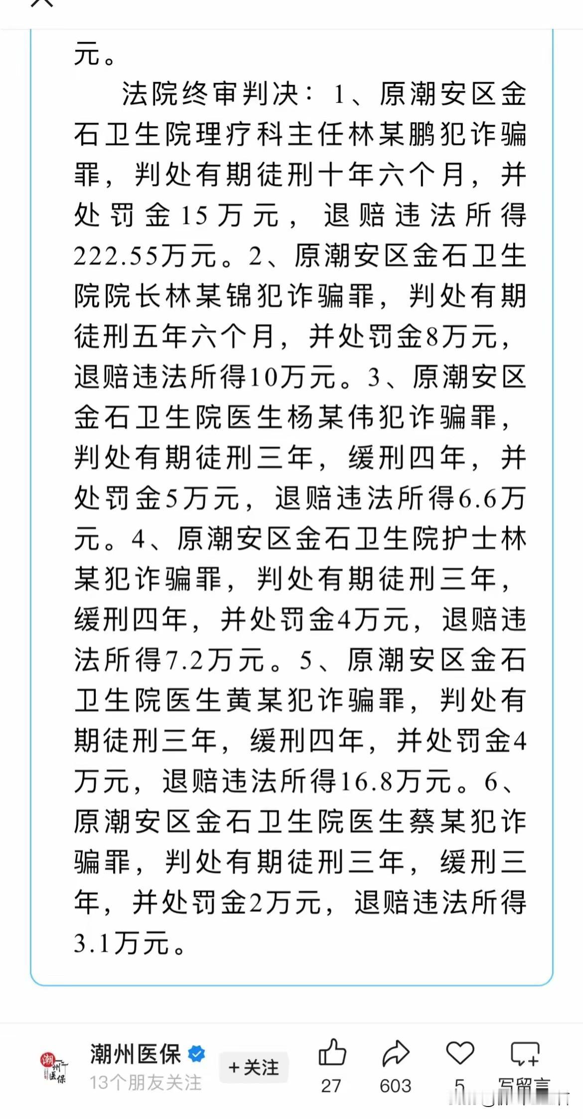 潮州这卫生院六人诈骗478.41万元获刑,真是大快人心!医保基金那可是老百姓的“救命钱”,他们竟敢伸手去骗,太没底线了。 之前潮州还曝光过康宁精神医院、康之宁精神医院欺诈骗保案,累计骗了2842.47万元。相关负责人邢某杰被判二十年,还得退赔损失。医保局也一直在加强监管,打击这类违法行为。这些人把罪恶之手伸向救命钱,就该受到法律严惩,只有这样才能保障医保基金安全,让老百姓看病更安心。