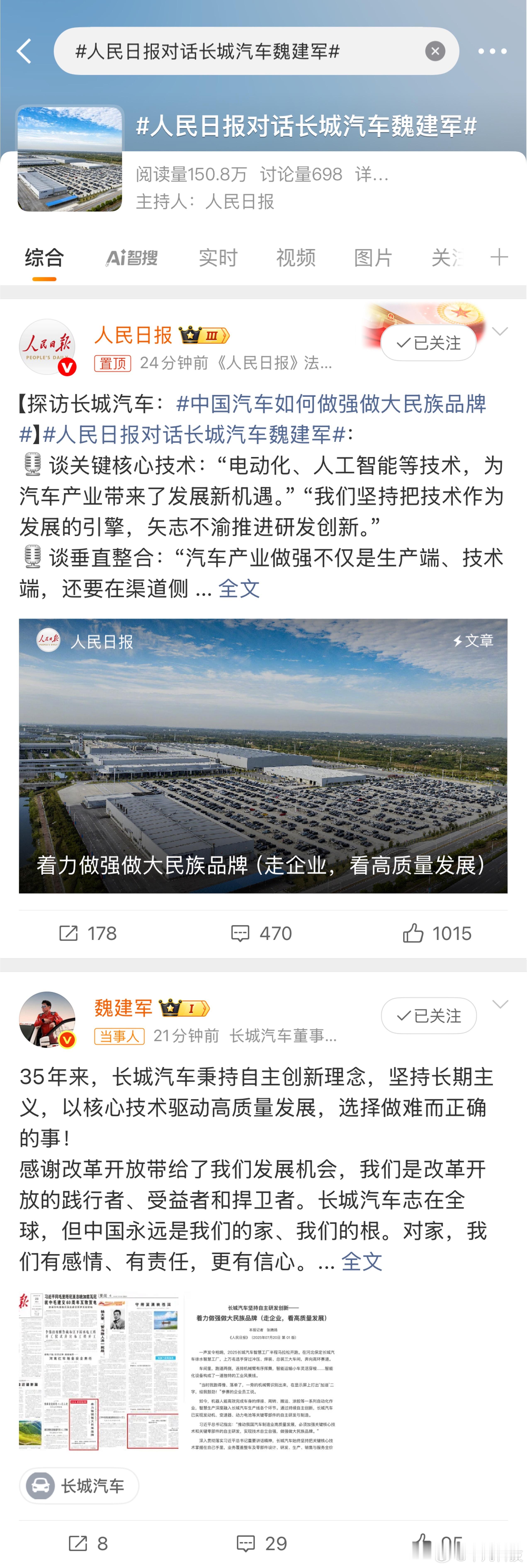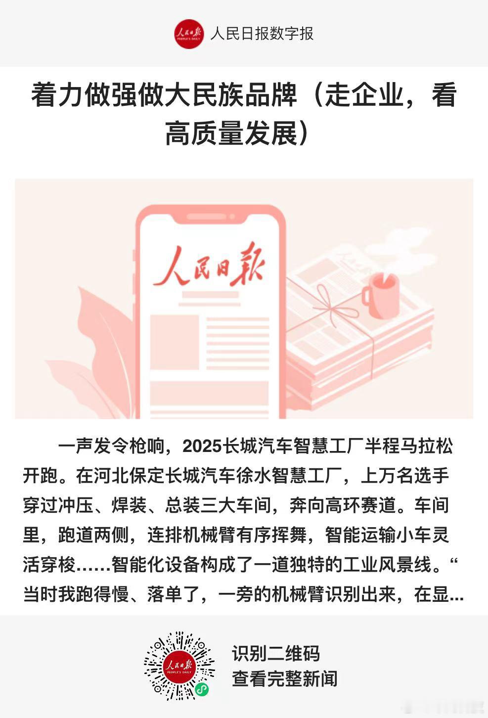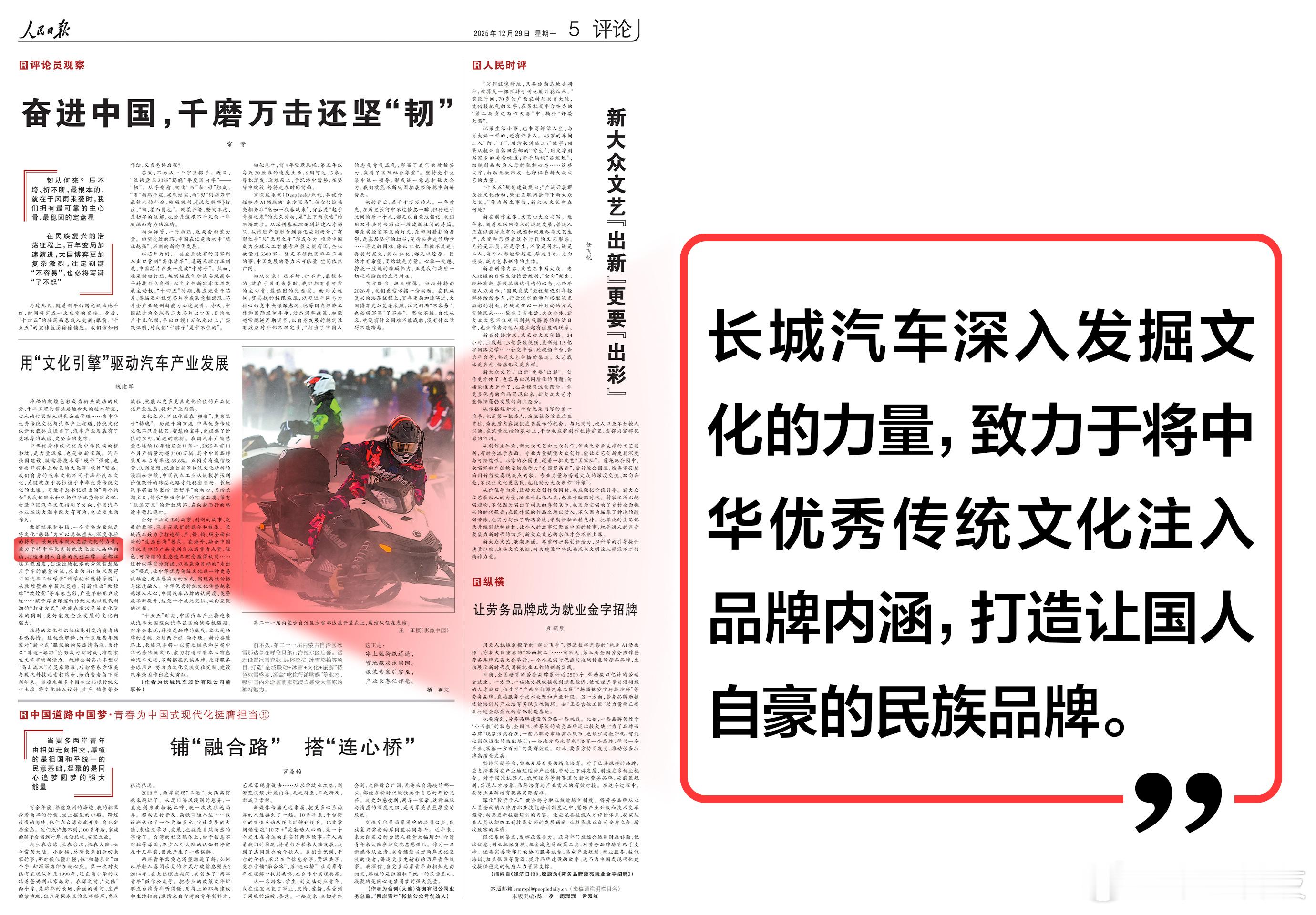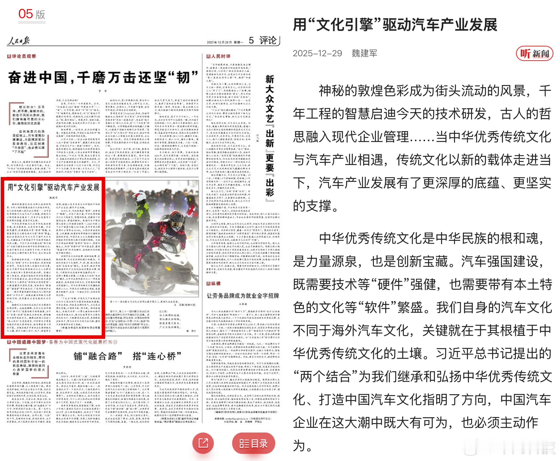 央媒评论版刊登魏建军署名文章2025年的长城汽车,真是把中华文化玩明白了!魏建军董事长的署名文章登上《人民日报》评论版,这可是国家级盖章认可,标志着“文化引擎”理念彻底立住了脚跟。要知道这一年长城可是人民日报的“常客”,头版夸自主研发、国际版赞巴西工厂出海、院士还为Hi4技术打call,这份认可实打实!从都江堰治水智慧里悟出门道,搞出了Hi4-Z功率分流技术,能量利用一点不浪费;把敦煌壁画的色彩调成车漆,敦煌绿、敦煌紫开在路上就是移动的文化名片;魏牌高山更是带着“高山流水”的意境,颜值和内涵双在线。技术当筋骨,文化做灵魂,再加上4.0T V8发动机这样的硬核实力,长城不仅让车靠谱好开,更让用户开车时能摸到文化根脉。这哪儿是造车,分明是把中国智慧做成了出行伙伴,用“技术+文化”的双轮驱动,实实在在诠释了中国智造的担当!