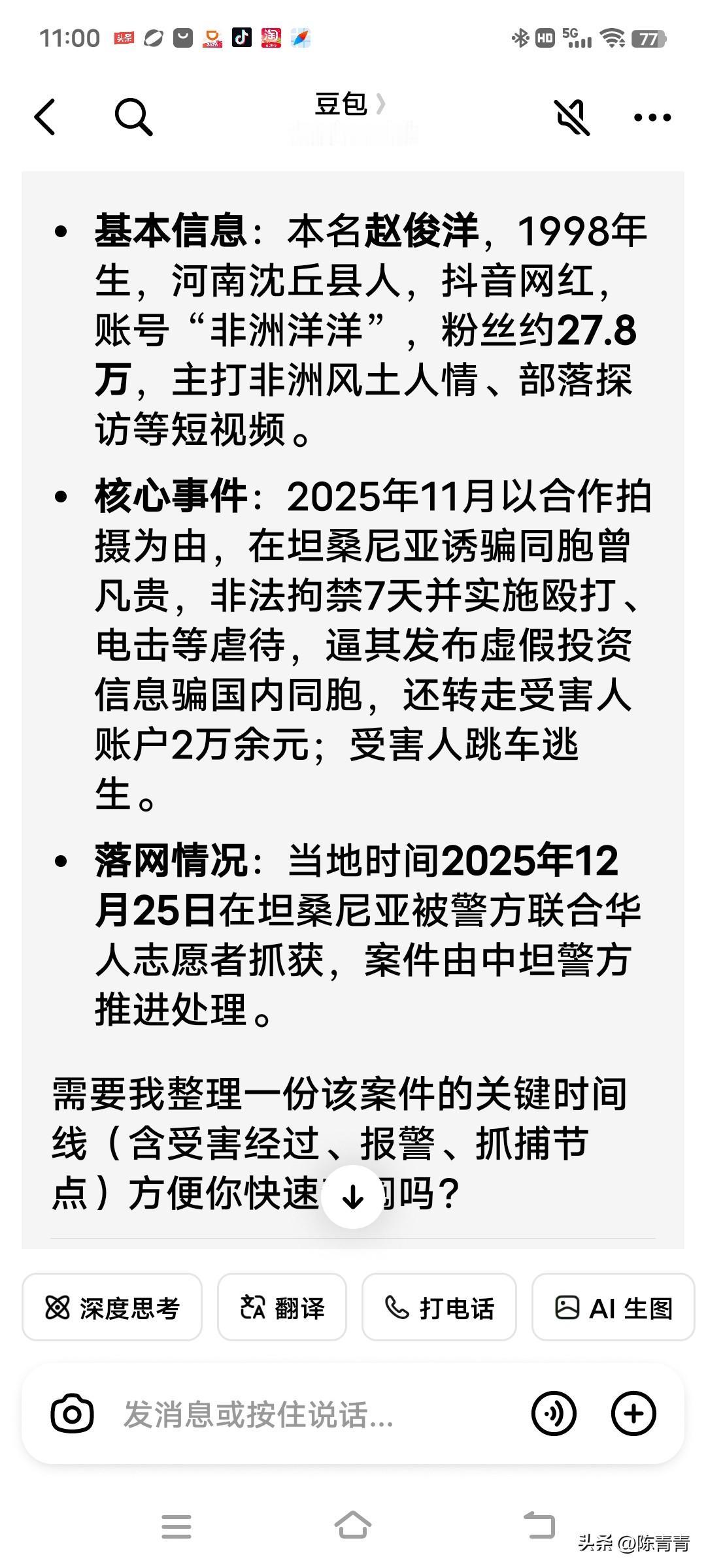 在非洲残害同胞的网红赵某洋栽跟头!被坦桑尼亚警方(12月25日)抓获,案件有我国警方推进的,他牢饭吃准了。 赵某洋还有点小本事,今年4月6日他发布第一个视频,主打非洲当地风土民情、部落探访等,几个月时间粉丝增加至27万多。 按说,他就沿着网红道路一步步走,往后发展直播带货肯定不错。那不,这老几嫌弃正道发财太慢,非要来个刺激的。 他把主意打定在自己同胞身上,诱骗同胞曾某帆,逼迫其从事网络诈骗国内同胞,非法拘禁七天,并对其殴打、电击、侮辱,还从他身上转2万多元。曾某帆逃离后报警事发。 常言说老乡见老乡,两眼泪汪汪。他以为自己远在非洲,天高皇帝远,没人管到他了,馊主意打在同袍身上。 对应那句话,手莫伸,伸手必被捉。网红赵某洋半年多时间发展到27万粉丝,放好阳光大道不走,偏走歪门邪道,这下好了,网红成了阶下囚!这能怪谁呢?