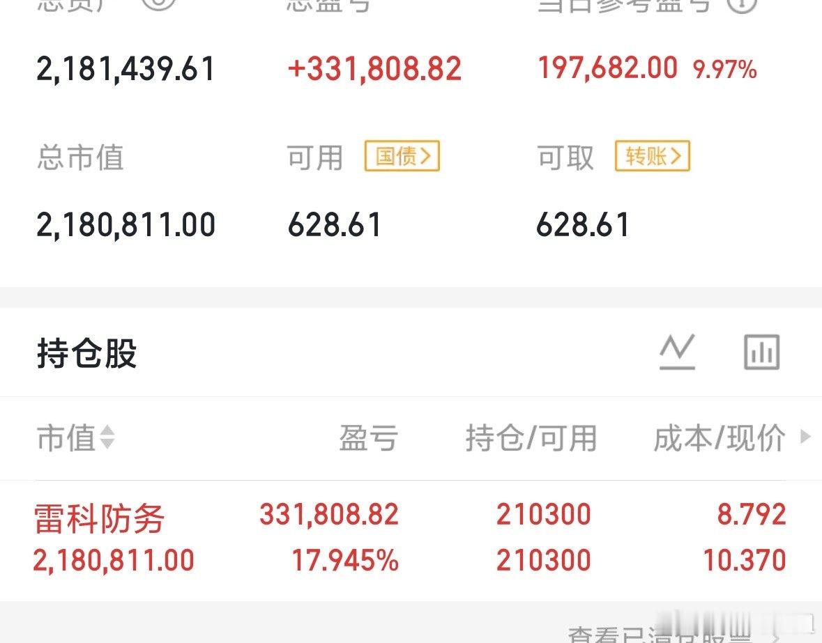 雷神大帝,统一山河!守了好多天,今天用于给我们来了个大太阳,🌞,阳光明媚。军工受催化大涨,多重利好叠加!!看到的点赞评论168,看三浪不变。今天盘口封单一百多万手,静等,一大早可以下班了。$雷科防务 sz002413$ 数字货币概念异动拉升国际银价跳水汽车股集体上扬