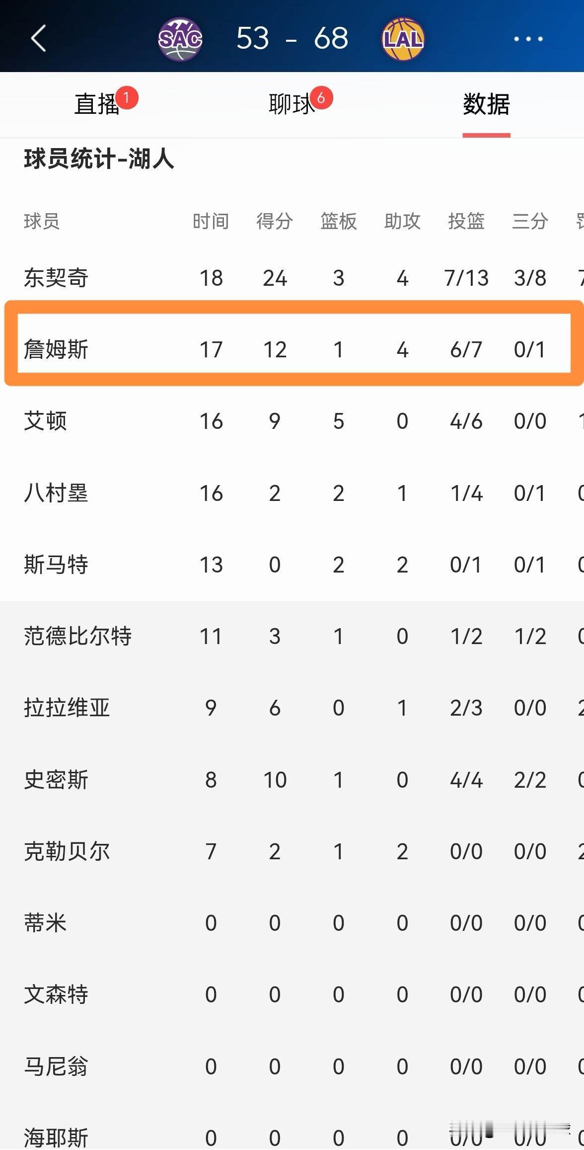 湖人超级巨星詹姆斯真是太让人意外了!在今天湖人主场迎战国王的上半场比赛中,詹姆斯首发出战17分钟,投篮7中6,其中三分球1中0得到12分1篮板4助攻,他的场上正负值为全队最高的+12。 众所周知,在湖人以往的比赛中,詹姆斯的场上正负值经常是全队最低的,可是今天詹姆斯的场上正负值却出乎所有人的意料。