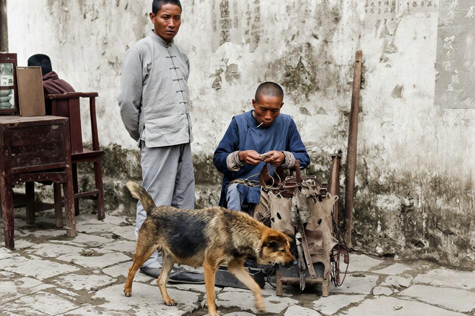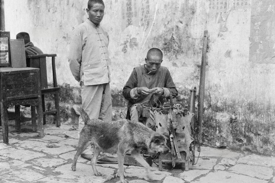 1917年,湖北省宜昌街头一角,一位中年修鞋匠坐在简易木凳上,专注缝补鞋子,身着对襟短衫,嘴里叼着烟斗,神态专注而平静。 他面前摆放着一个典型的手工鞋匠工具架,木架上挂满鞋楦、皮条、锥子、锤子、线团等工具,地面石板散落杂物。一条瘦狗正从摊前走过,增添了市井生活的随意感。左侧站着一个少年,着长衫,双手背后,好奇旁观。 街头修鞋匠是民国城市常见的“挑担匠”或“坐地摊”手工业者之一,他们多为流动或固定在街巷角落,工具简单,服务于普通民众。那时鞋子多为布鞋或皮鞋,耐穿但易损,修鞋是刚需。匠人多靠手艺维生,收入微薄,却技艺娴熟。