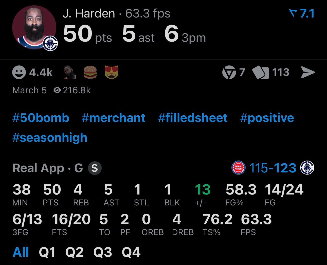 美媒:詹姆斯·哈登最近四场比赛的表现:28 分 - 4 篮板 - 7 助攻34分