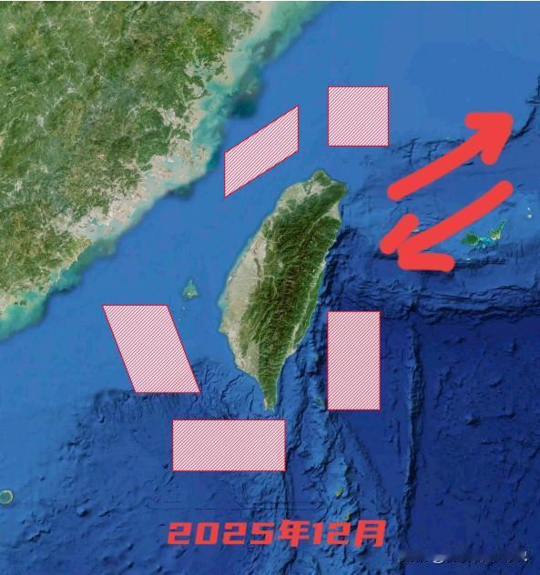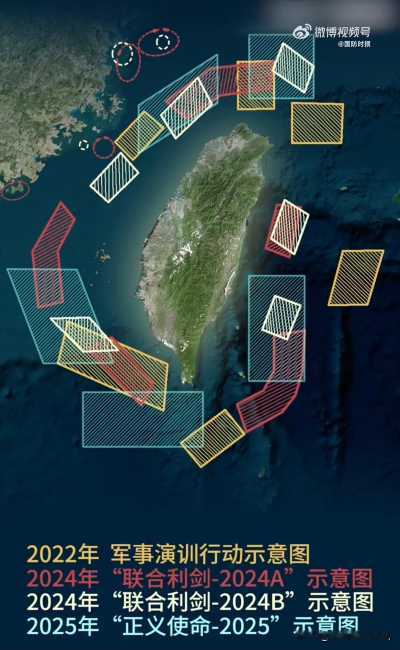一看见这张今年的军演图就觉得很有意思,看来年末这份大礼是相当的给力啊!不知道大家从第一张图看出点儿什么没有?我个人看见时脑海里就蹦出了一个战术“围三缺一”,这四个字根源于《孙子兵法》中的“围师必阙,穷寇勿迫”。大家注意看一下缺口的方向在哪里?是不是台湾省的东北面,东北面是什么地方不用我多说了吧。我觉得至少两层意思吧:其一、如果癞蛤蟆想跑,就只有往东北去,这样就可以穷追猛打,看看有事论的叫嚣者敢不敢来管事儿;其二,给有事论叫嚣者开一道管事儿的门户,看它敢不敢来管?怎么样,有没有种贴脸开大的感觉。当然,就连我这个自媒体博主都能看出的意图,未必是真正或者全部意图。反正吧,不管怎样,看到从2022到2025的军演图就是爽!