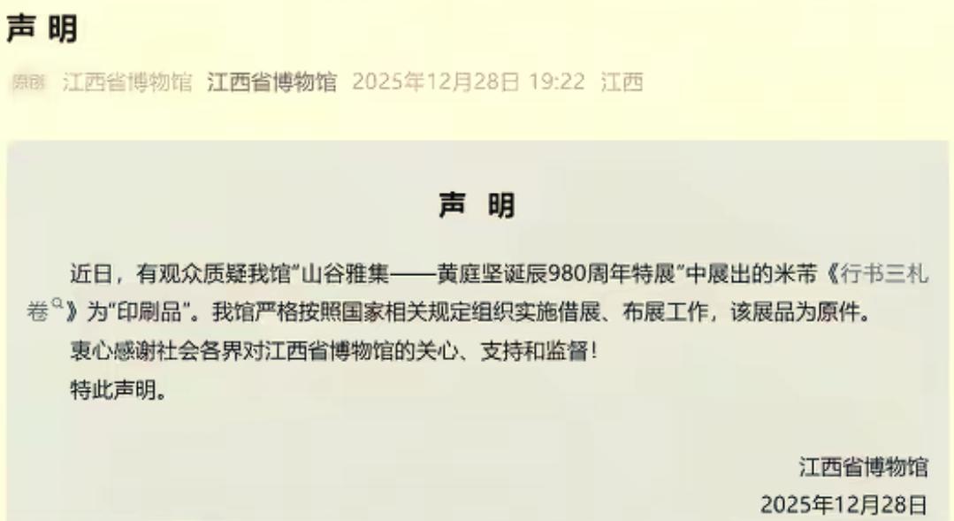 听说了吗? 江西博物馆和故宫博物院这俩“文博界巨头”居然因为一幅米芾的书法掐起来了,这瓜吃得我那叫一个上头! 事情是这样的,江西博物馆搞了个黄庭坚诞辰980年的特展,还拿出了包括米芾《行书三扎卷》在内的6件宋代真迹。好多书法家大老远从全国各地奔过去,就想亲眼瞧瞧真迹长啥样,结果到了现场直接懵圈!这展出的《行书三扎卷》和故宫官网上的根本不是一回事,墨色平得跟板砖似的不说,连印章和字的上下层都颠倒了,到处都是和原作对不上的地方。 更绝的是,书法家们当场质疑,江西博物馆的工作人员还挺刚,拍着胸脯说这就是从故宫借来的原作,当场就给故宫打电话对质。你说这戏码多精彩,要是故宫咬定借出去的是真的,那就是江西博物馆有人暗戳戳来了个“偷梁换柱”;要是江西博物馆非说自己收到的就是这幅,那故宫可就捅了大娄子了。 现在两边各执一词,江西博物馆刚发了个声明,说这是“原件”,不是“真迹”。啧啧,这里面的弯弯绕绕,你可得好好品品。我跟你讲,这事要是真的实锤了,那可比之前南京博物院那事儿热闹多了,绝对是文博界的“年度大戏”!