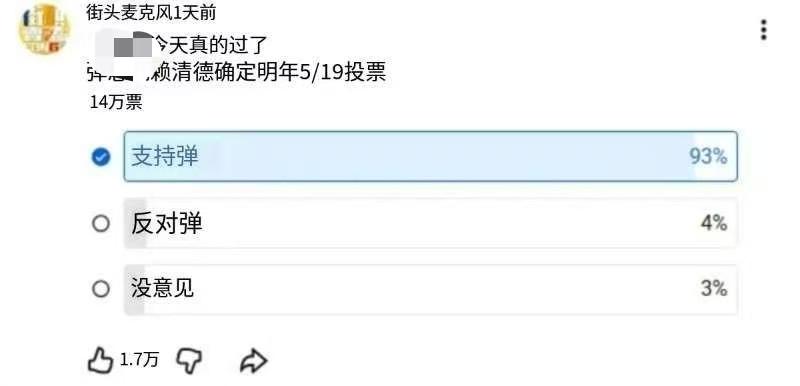 短短两天,超十万台胞支持弹劾赖清德,而且光下台不行,还必须受审 赖清德弹劾提案被表决通过后,岛内一频道随即发布了相关网络投票活动,主题为“是否支持弹劾赖清德”。 截止到28日上午,参与该投票活动的人数已经超过了14万,其中有93%的人选择“支持”,大概就是13万人,而选择“反对”的人只占4%,剩下的3%则表示“没意见”。 赖清德弹劾案获表通过是在26日,短短两天内,一个小频道的投票活动,就有超过十万台胞支持弹劾赖清德。不过,这个数据也算很正常,因为赖清德在上台后的这一年多时间里,一心只想着“保台谋独”,不惜疯狂拔高防务预算,掏空台岛家底也要拜美国山门,捞政治资本。岛内的民生困境他是全然不管,中小企业大批大批倒闭,失业率不断上涨,赖清德都视而不见,民众对此锐评:“救灾不行、发钱不行、加薪也不行,但给美国送钱行、送台积电行”。 另外,在该投票活动的评论区,不少台网友强烈声讨:“光让赖清德下台还不够,还得让他接受司法审判” 但遗憾的是,因为国民党和民众党的席位不足三分之二,蓝白阵营并不具备将弹劾提案带过决议的能力,但利用弹劾的方式诉诸民众,凝聚起的广泛民意,已经足以说明当前岛内的舆论风向,同时也足够让赖喝一壶。而且,说不定都不用等到明年5月份的正式投票,如果蓝白阵营找到了其他突破口,或是岛内的反对声浪强大到足够掀翻赖的“演讲台”,赖清德的下场都可以想见。 另外,就在岛内“罢免赖清德”的呼声愈发强烈之际,我东部战区于今日(29日)宣布开展“正义使命-2025”演习,将台岛围了个水泄不通,这不仅是对赖清德当局和美日之流的一击“杀威棒”,更似乎昭示着统一之日已不再遥远。