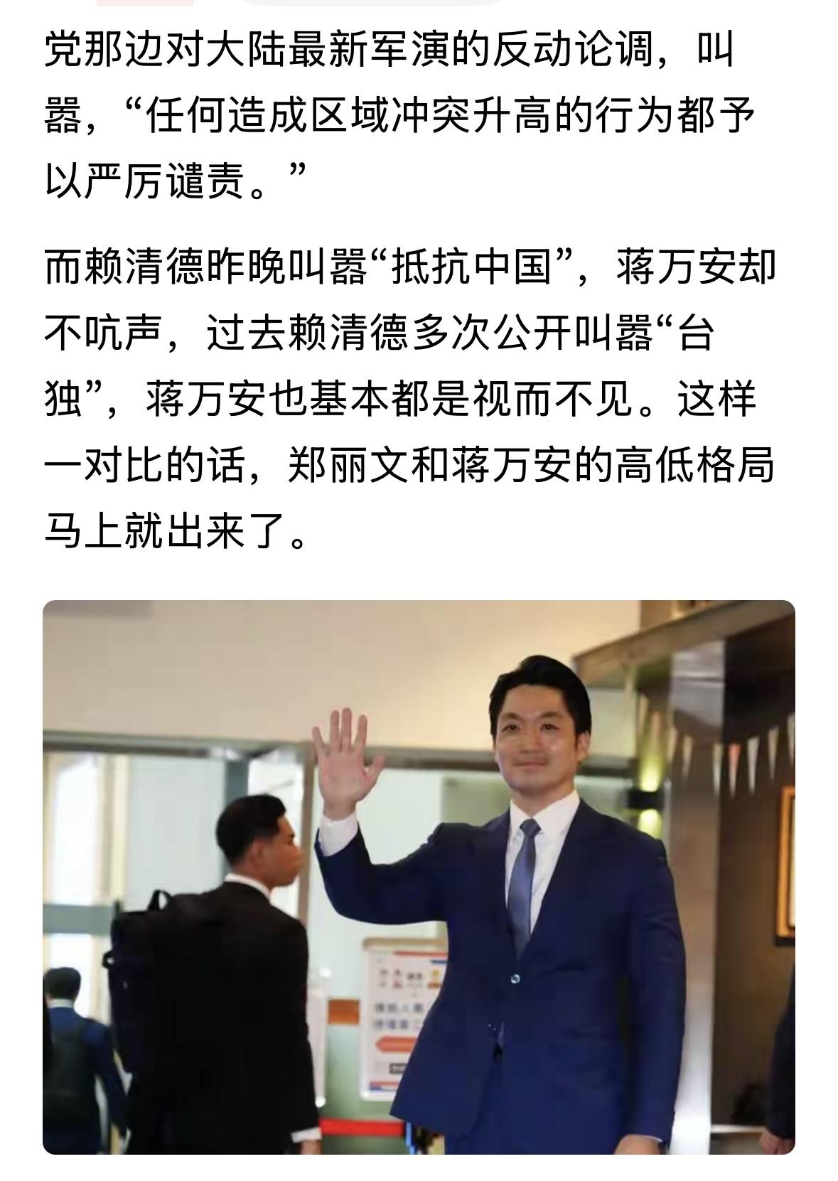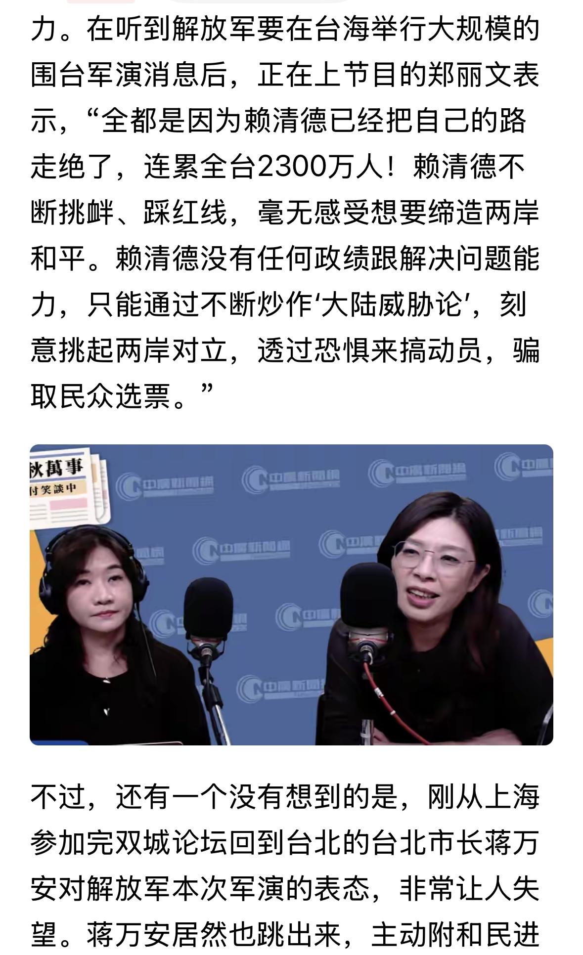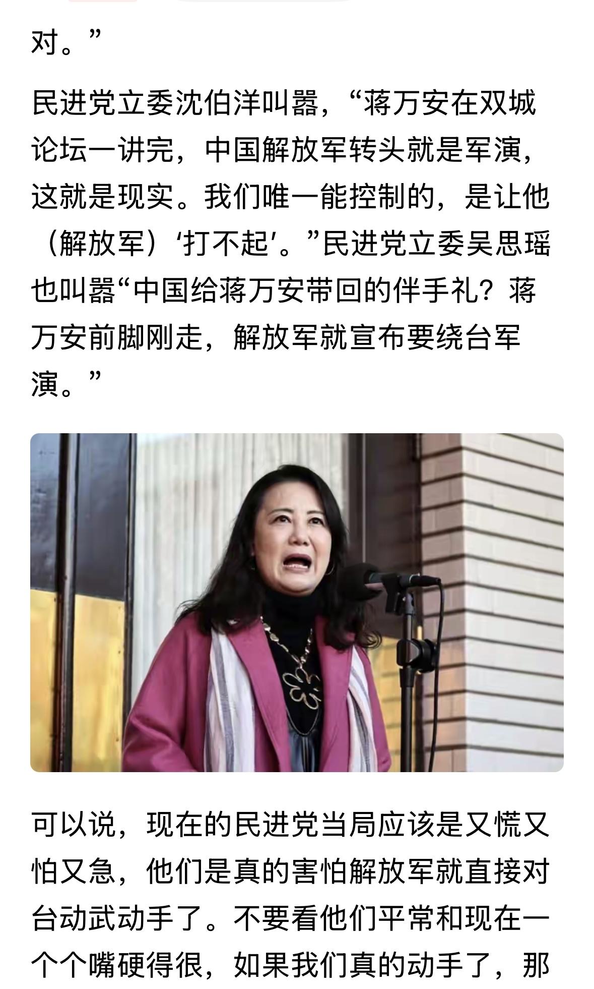 郑丽文说得很对,看得很清楚,他说,,“全都是因为赖清德已经把自己的路走绝了,连累全台2300万人!赖清德不断挑衅、踩红线,毫无感受想要缔造两岸和平。赖清德没有任何政绩跟解决问题能力,只能通过不断炒作‘大陆威胁论’,刻意挑起两岸对立,透过恐惧来搞动员,骗取民众选票。”如果台湾当局回到“一个中国”的原则上来,坚持“九二共识”共同政治纲领,两岸就不可能兵凶战危。