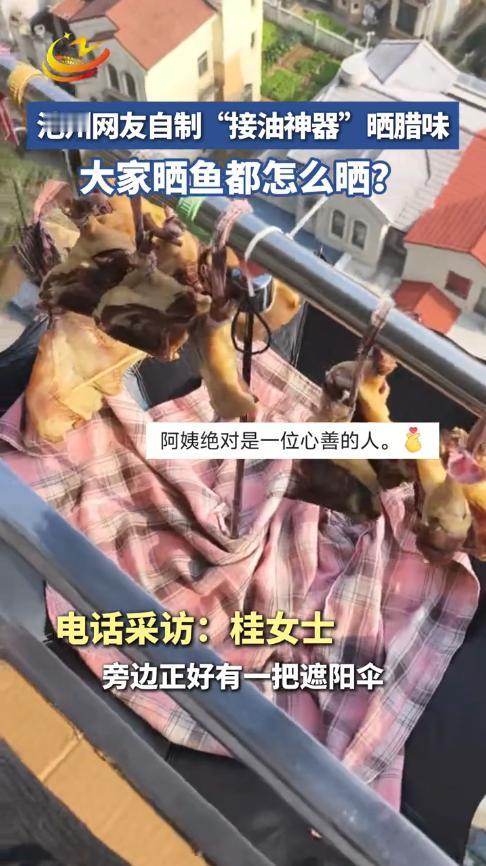 “人怎么能这么聪明!”12月27日,安徽池州,一老人在阳台上晒腊肉,为了不让油滴到楼下邻居家里,她见旁边有把遮阳伞,就反着挂在了腊肉下面,害怕伞漏水,老人又铺上一块布,这样一来就不用担心了。网友:中国好邻居! 每年冬天,不少村民都会将家中养的猪杀掉,留着过年的时候吃,而为了延长猪肉的保存时间,就会将剩下的肉拿来做腊肉。 腊肉的制作方法也很简单,挂在太阳底下晒就行了,但是气温不能太高,不然容易把肉晒变质,而且在晒肉的过程中,还需要注意有油滴落。 前不久,桂女士的母亲在家就制作起腊肉,然后让桂女士挂在阳台上晾晒,由于下面有挡板,所以她也不担心油会滴到下面的邻居家里。 不过母亲看后还是不放心,刚好看到旁边有把伞,她打开后挂在肉下面,这样一来,油就全落在伞里面了,饶是如此,母亲还是有所担心,万一伞是坏的咋办?她就又在伞上铺上一层布,这回才算把心放进肚子里! 桂女士将母亲的好方法分享到网上,很快就引起了网友的注意,大家对此赞不绝口,觉得这么有素质的人真是少见,很多人晒腊肉才不管这那的,值得推广。 信息来源:《池州网友自制“接油神器”晒腊味,大家晒鱼都怎么晒?》池州新闻