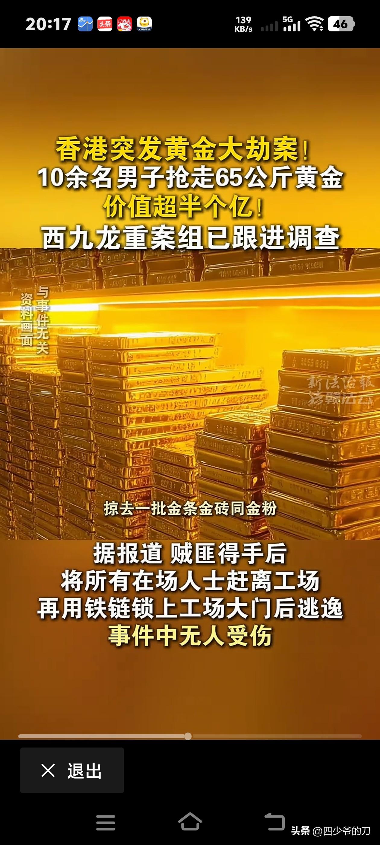 难怪我买的黄金股票跌成狗了,原来黄金被抢了[捂脸] 这都什么年代了,怎么还能发生这种事情?这些个劫匪难道就没想过这钱他们有命拿没命花吗?65公斤可不是个小数目啊!按照现在的金价,要值5300多万。不过想想也不划算啊!劫匪有十个人呢,你想啊!抢来的黄金肯定不可能按国际金价卖出去,就打算他们卖个八折,那就只有4200万,每个人才420万,在香港连个房子都买不起。照现在这种高科技办案手段,抓住他们只是时间问题,这要是抓住了,不得把牢底坐穿啊?