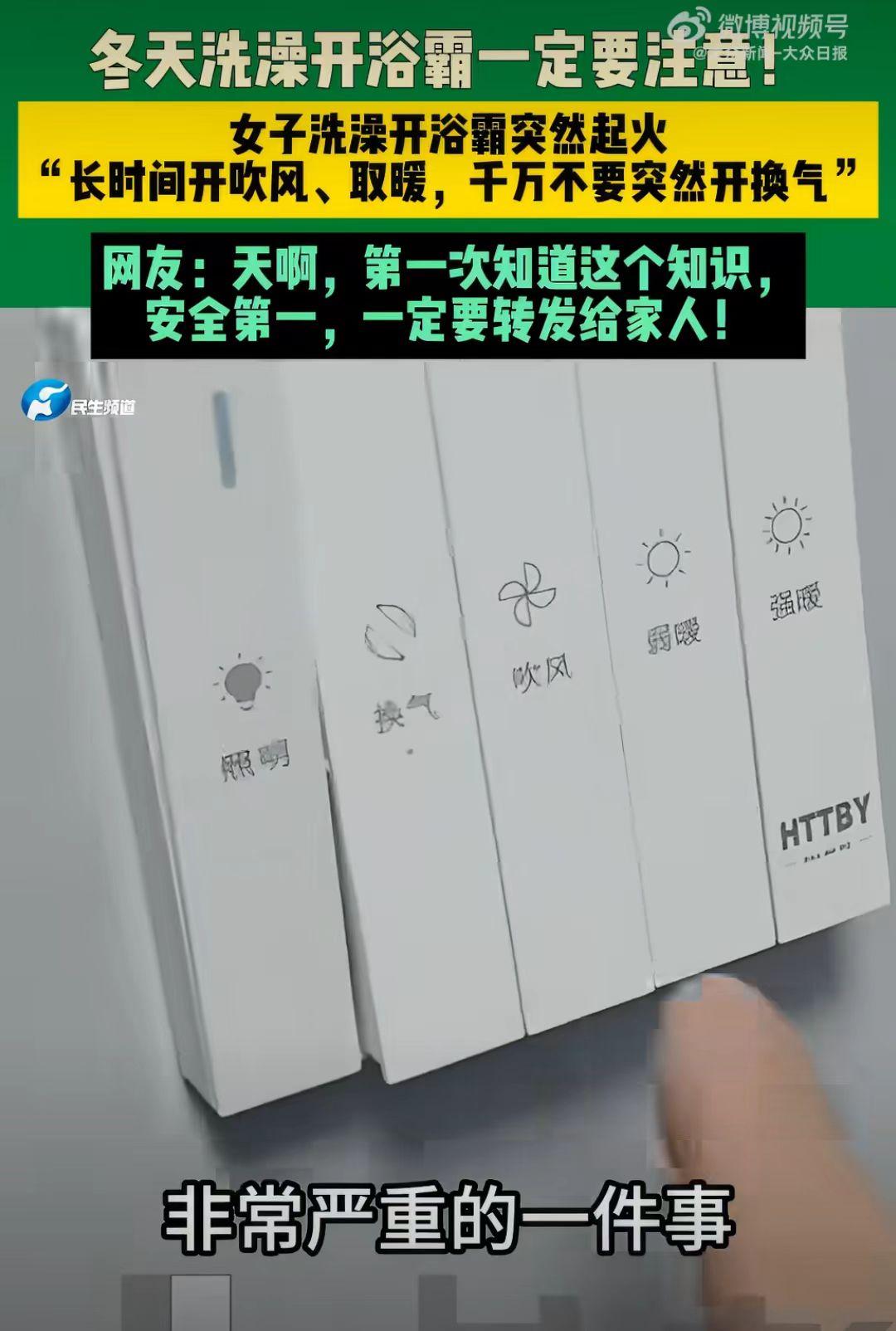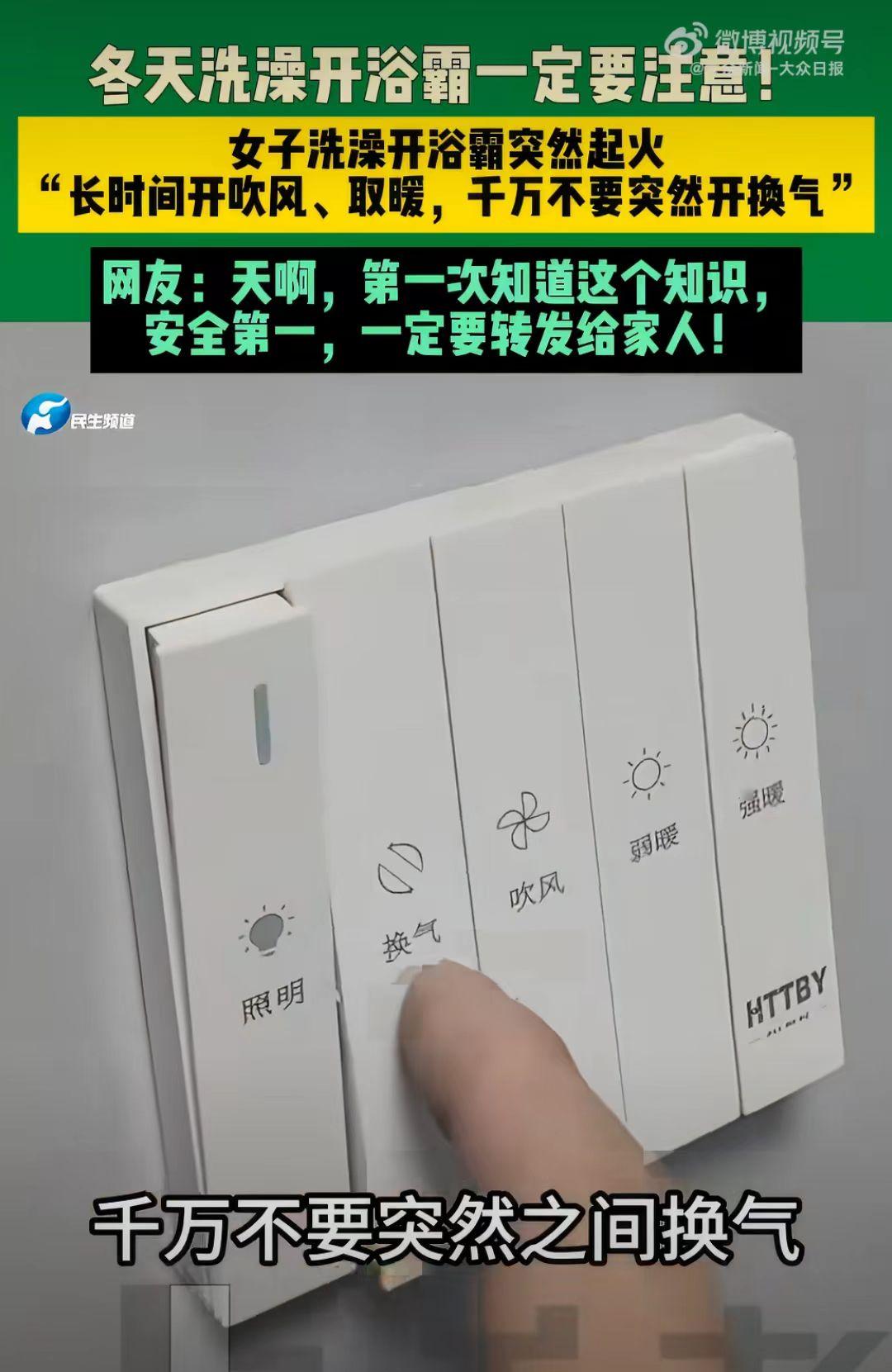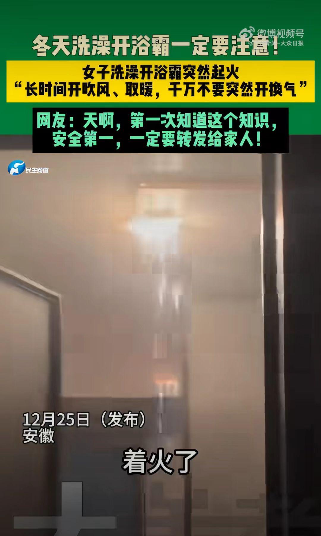 12月25日,安徽一女子在家洗澡,因为天气太冷了,就和往常一样开浴霸取暖,把开关打开的一瞬间,洗澡间爆炸了,洗手间瞬间就烧着了。 冬天冷,洗澡经常开浴霸取暖是很正常的事情,可是怎么也没想到,会爆炸。 这听着就很吓人,哪家冬天不用浴霸呢? 这要是烧着了,不说损失了,就是烧伤了也很疼啊! 好在这个女子躲得快,人没事。 通过检查:这名女子在洗澡时,先开浴霸灯取暖半个小时,感觉有点闷,就把换气打开了,结果一下子就失火了。 原来长时间开浴霸、吹风,再去开换气时,导致高温设备突遇冷湿空气,热胀冷缩效应引发短路或爆燃。 说白了,以后在家洗澡时,时间不要太长了,长时间开暖气、浴霸,等澡洗好后,把暖气关了,等一会在开换气。 另外,隔段时间就检查电器、电路是否老化,老化的要及时更换。 大家对此怎么看,欢迎大家评论区留言。浴霸温度 浴霸爆燃 供暖爆炸 取暖灯爆炸