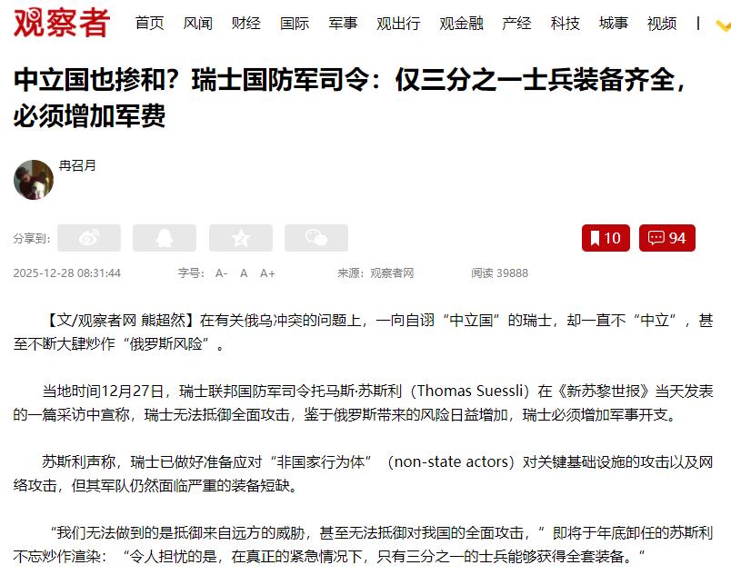 瑞士已经没有资格说自己是“中立国”了!当地时间12月27日,瑞士国防军司令苏斯利在报纸采访里说,瑞士挡不住全面攻击,因为俄罗斯的威胁越来越大,必须多花钱搞军事。他还说能应对网络攻击这些,但军队装备缺得厉害,只有三分之一的士兵装备齐全。 说实话,苏斯利这话说得就是装样子,把假中立的真面目露得明明白白。 所谓“俄罗斯风险”根本就是借口,核心就是借着俄乌冲突的机会,扔掉守了两百年的中立招牌,抱西方的大腿,顺便找个理由多要军费。 那“三分之一士兵装备不全”听着吓人,好像是俄罗斯逼的,其实都是瑞士自己长期不重视国防,一门心思讨好西方造成的。 这装备短缺的根子,还是瑞士自己砍军费闹的。冷战结束后,他们就把国防当成省钱的地方,将军费砍了一多半。 靠砍军费省下来的钱,最少也有400亿瑞士法郎,全砸在跟西方的经济、军事勾结上了。长期这么抠,装备能不老旧吗? 现在用的火炮还是上世纪七十年代的老古董,装甲车也破旧不堪,士兵都担心能不能用。 现在要把装备配全,得花500亿瑞士法郎,早不重视国防,现在拿俄罗斯当挡箭牌,算盘打得也太精了。 更让人看不起的是,瑞士嘴上喊中立,做事早把中立抛到脑后了。2022年俄乌冲突刚爆发,它装了4天中立,就全票通过决议跟着欧盟制裁俄罗斯。 不仅冻了俄罗斯将近90亿美元的资产,还扣了俄罗斯富豪的游艇、飞机,连人家存的艺术品都没放过。 要知道瑞士银行的保密制度是立了法的,为了讨好西方,直接把俄罗斯客户的信息交给美国,把百年信誉当礼物送了。 后来还跟着搞第16轮制裁,连建筑、会计这些民生服务都不让给俄罗斯提供,还禁止买俄罗斯黄金,彻底把中立的遮羞布撕烂了。 这么折腾的后果,就是瑞士自己吃大亏。本来大家都觉得把钱放瑞士最安全,这一制裁,信任全没了,资金疯狂往外跑。 2022年外国客户提走了近1500亿瑞士法郎,到2025年私人财富流失了4800亿美元,最狠的时候一天就跑100亿。 连有167年历史的瑞士信贷银行都扛不住,亏了80亿瑞郎,客户48小时提走690亿,最后被低价收购。 后来美国又调查另一家银行,又导致1200亿美元外流,一万多个工作岗位没了,曾经风光的金融业彻底不行了。 除此之外,瑞士还在军事上贴西方,又是要跟北约合作,又是加入西方的防务项目,还不断放宽武器出口限制。 2022年军火出口创了新高,这些武器看着没直接卖给交战方,其实很多都流进了冲突地区。俄罗斯早就说瑞士没资格算中立国,把它列入了不友好国家名单。 说到底,瑞士现在的处境都是自找的。不是俄罗斯威胁它,是它主动凑西方想占便宜,把中立信誉和经济根基都搞砸了。 现在又拿俄罗斯当借口加军费,就是想彻底绑上西方战车。要知道瑞士能在两次世界大战里平安无事,能成为财富中心,全靠中立。 现在为了讨好西方毁了立身之本,真是捡芝麻丢西瓜。这假中立的嘴脸,谁都骗不了,最后只会让自己吃更大的亏。