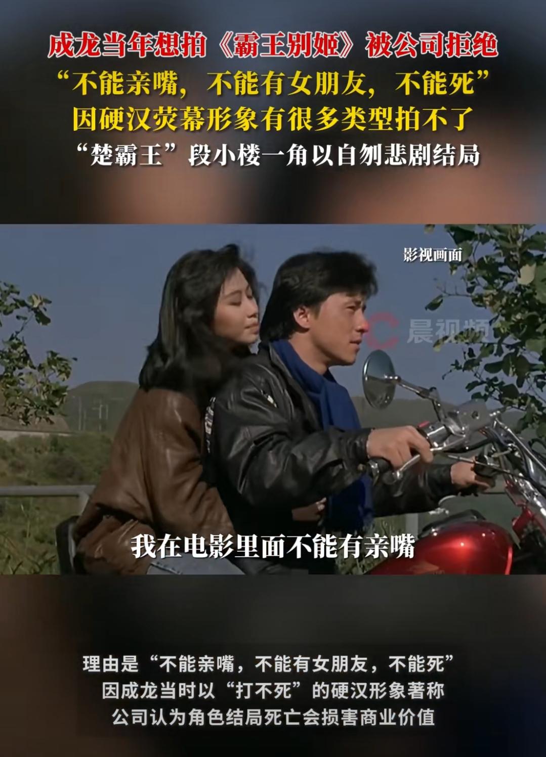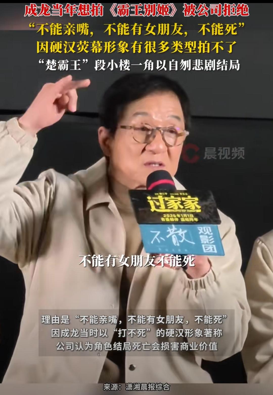 成龙竟错失《霸王别姬》段小楼!离谱理由笑喷 谁懂啊!成龙自曝当年超想演《霸王别姬》的楚霸王段小楼,结果被公司一票否决! 理由简直离谱到家:不能亲嘴、不能有女朋友、还不能死!合着成龙大哥当年的人设,是焊死在“硬汉不死战神”的框里了? 最后只能眼睁睁错过这个经典角色,现在说起来还满是遗憾,这波属实是被老东家的“刻板人设”困住了!