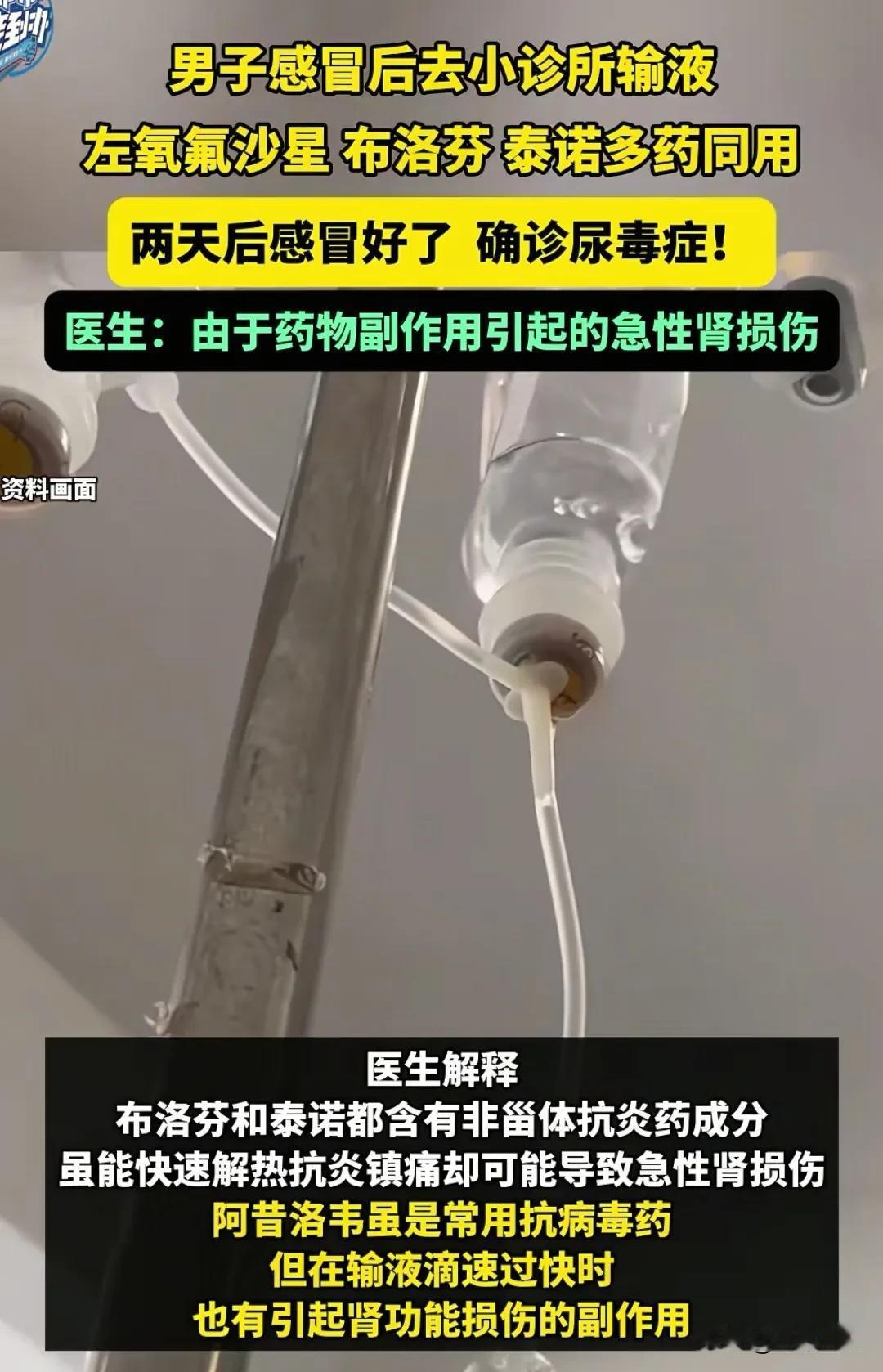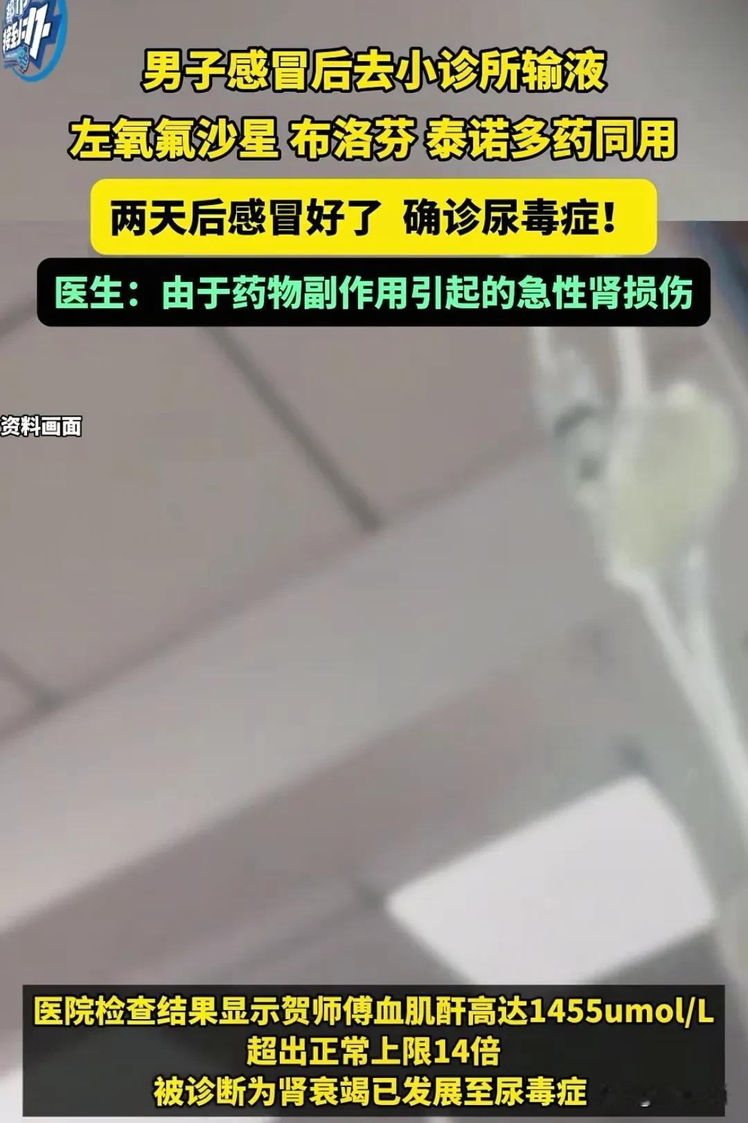 浙江宁波,男子感冒了,还发着烧,浑身不舒服,他觉得是小病一桩,就到小诊所去输了2天液,结果感冒是好了不少,他却没啥尿了,一天才一次,而且尿量很少,他马上意识到事情不对劲,就去检查,结果被诊断为尿毒症,正是药物的副作用引起的,他害怕了。 贺先生躺在床上,感觉整个人浑身没力,身体还发冷,他吸了吸鼻涕,摸了摸自己的额头,感觉还有些烫。 他这才意识到,这一次感冒来势汹汹,再不吃点药,他估计得难熬一段时间,他起身就打算去看医生。 55岁的贺先生觉得自己一把年纪了,感冒这样的小病,他不知生过多少次,每次他到小诊所吃些药就好了。 这一次他也依然来到小诊所,他还是打算吃几天药,病就好了。 但医生看了看他的病,就告诉他,已经发了烧,病就是严重了,需要输液才能更快地好起来。 贺先生拖着沉重的脑袋,也觉得自己很不舒服,既然医生建议输液,那就输液,反正输液比吃药好得快。 就这样,医生为了更快地治好他的病,一下子使用了猛药,在输液的过程中,不但给他使用了左氧氟沙星,还有使用布洛芬,泰诺等药。 因为用药比较猛,贺先生输了两天的液之后,果然好了许多,也不流鼻涕了,也不发烧了,感觉整个人都清爽了很多。 但他很快又发现,自己的小便有问题了,平时一天上几次厕所的他,居然一天才上一次厕所,并且只尿了很少的尿。 这太不正常了,本来感冒,他就喝了不少水,贺先生马上意识到,自己身体又出别的问题了,而且这一次问题更严重,他再也不敢去小诊所敷衍自己的身体了,他来到了医院检查。 结果这一检查,吓了他一身冷汗,医生告诉他,他得了尿毒症。 只是感冒而已,怎么无缘无故就得了尿毒症了呢? 贺先生不解地问医生,为何感冒会导致尿毒症,医生就问他了,感冒的时候用了什么药,有时候用药不对也会导致肾损伤。 贺先生这才赶紧去小诊所查看自己感冒的时候,到底用了什么药,结果这一查,才发现小诊所给他的用药实在太猛了。 那个布洛芬和泰诺同时使用,虽然能够快速解热抗炎,但也会导致肾损伤。 医生告诉贺先生,他的尿毒症,就是由于这两个药的副作用导致的。 贺先生听了医生的话,非常后悔,他只怪自己,为了感冒快点好,他就去小诊所,如果他当时能够重视自己的身体,到医院去开药,他也不会遭此罪。 贺先生其实也很清楚,很多小诊所之所以看小病,能够快速看好,那是因为他们用药比较猛,但贺先生没想到他们用药如此之猛,导致他产生了用药的副作用。 如今尿毒症严重影响了他的身体,给他的身体健康造成了很大的损害。 他感冒贪图快点好,去了小诊所,不料给自己的身体带来了大伤害。 看到贺先生的遭遇,很多人也有同感,都觉得小诊所用药实在太猛了,为了图个好名声,让看病的人觉得小诊所的技术好,他们用药不顾后果。 即使是小孩来看病,也会开七八片小药片,就是为了能够快点把病治好。 这样治病虽然能够快很多,但同时这也有很大的危害,有时候药的副作用,会导致病人出现新的身体损害。 那么贺先生遇到这样的事情该怎么办呢? 首先,在这件事当中小诊所用药过猛,没有考虑到药物对人体的副作用,他们存在医疗过错。 《民法典》第1218条规定:患者在诊疗活动中受到损害,医疗机构或者其医务人员有过错的,由医疗机构承担赔偿责任。 既然小诊所存在医疗过错,那么他们就得承担相应的责任。 其次,贺先生的身体已经出现了人身损害,他可以要求小诊所赔偿。 《民法典》第1179条规定:侵害他人造成人身损害 的,应当赔偿医疗费,护理费,交通费,营养费,住院伙食补助费等为治疗和康复支出的合理费用,以及因误工减少的收入。造成残疾的,还应当赔偿辅助器具费和残疾赔偿金;造成死亡的,还应当赔偿丧葬费和死亡赔偿金。 只是贺先生看了个小感冒,就害得自己肾损伤,得了尿毒症,代价实在是太大了。 那么你对贺先生的遭遇有何看法?