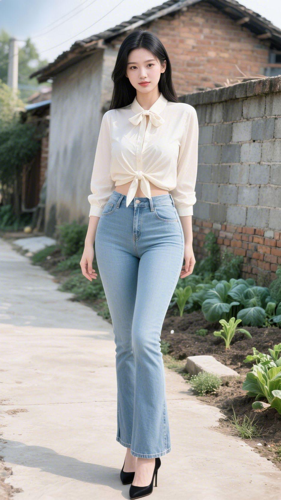 村径清风揽温柔 乡间小路的水泥路面泛着浅淡的光,砖瓦房的灰墙旁,青菜秧苗在泥土里舒展着绿意。米白色衬衫系成灵动的结,领口的蝴蝶结轻垂,与浅蓝牛仔的随性相融,黑高跟轻叩路面,敲出清脆的节奏,为质朴的乡野添了几分雅致。 长发垂落肩头,眉眼沉静如秋水,步履间带着从容的温柔。乡野的风掠过耳畔,吹起衣角的褶皱,也揉碎了城市与田园的边界。原来美好从不限定场景,一件简约的穿搭,一段乡径的漫步,便能让日常生出诗意,让心在自然里寻得安稳的归处。 乡村生活 日常穿搭