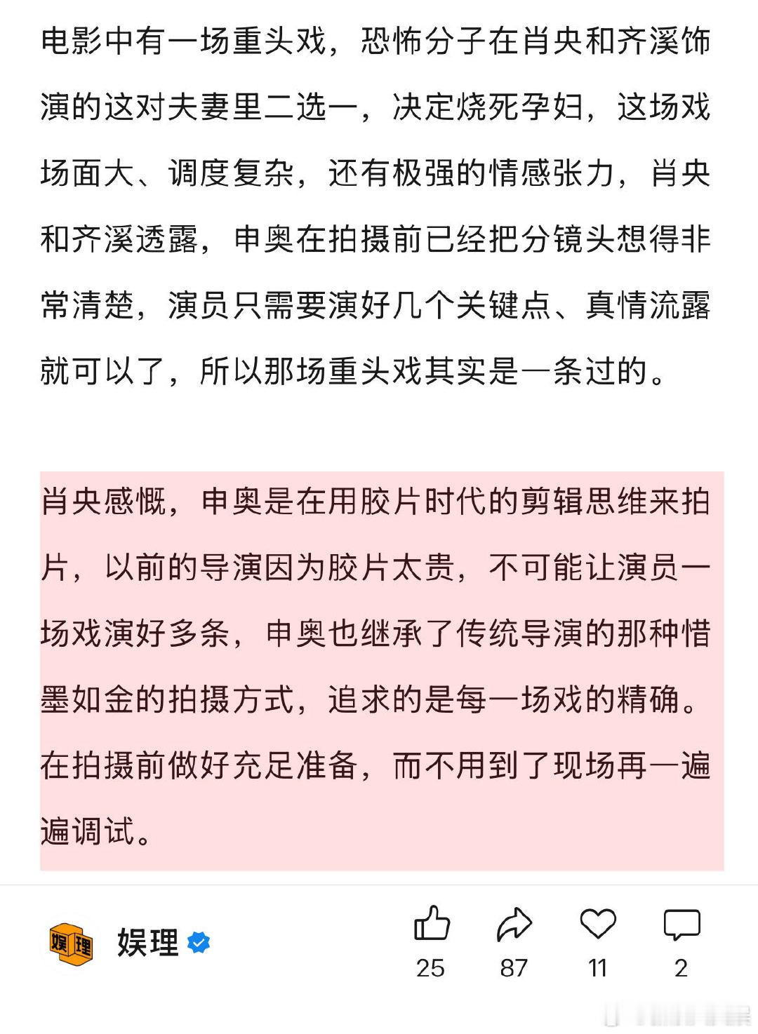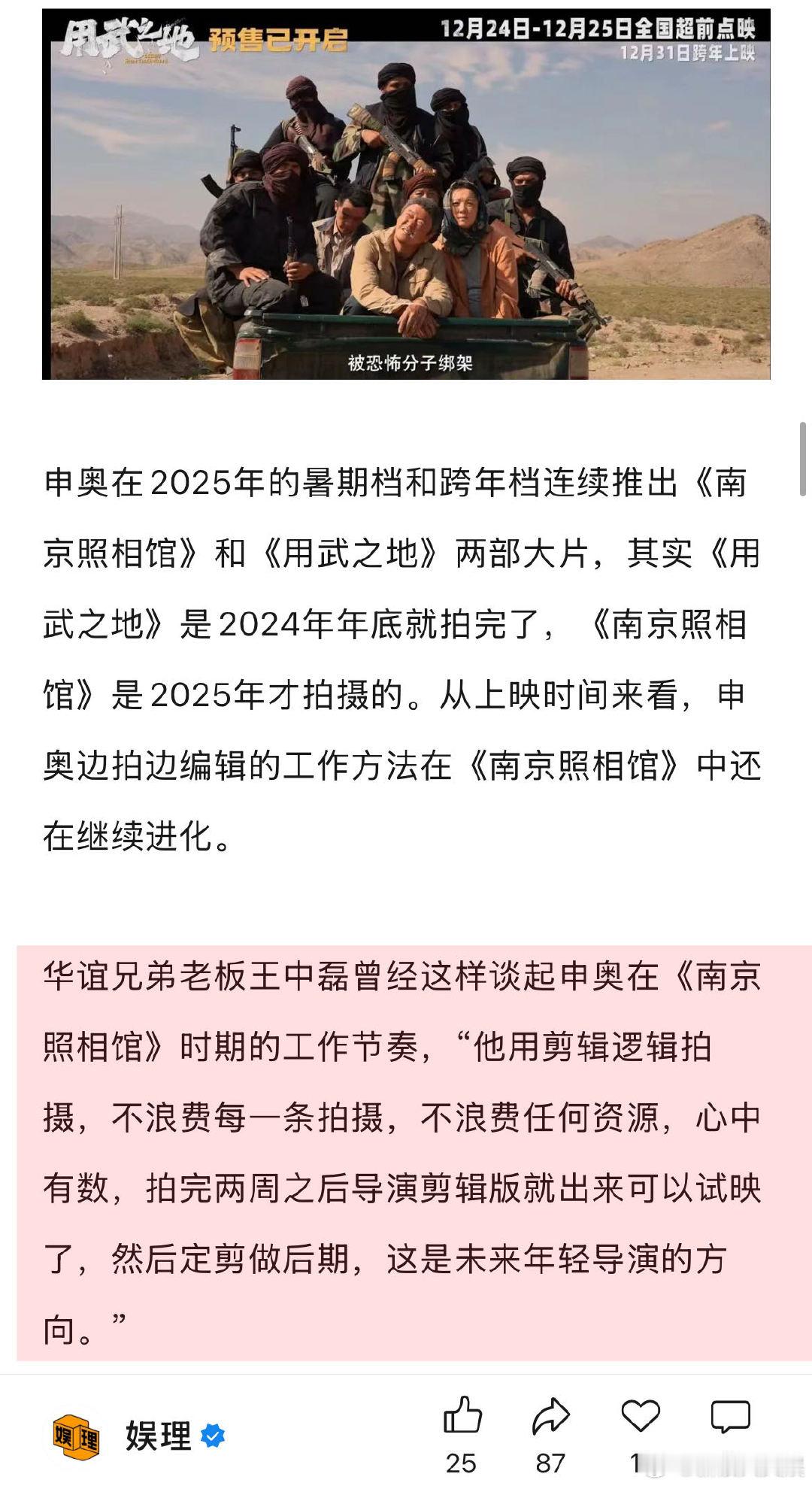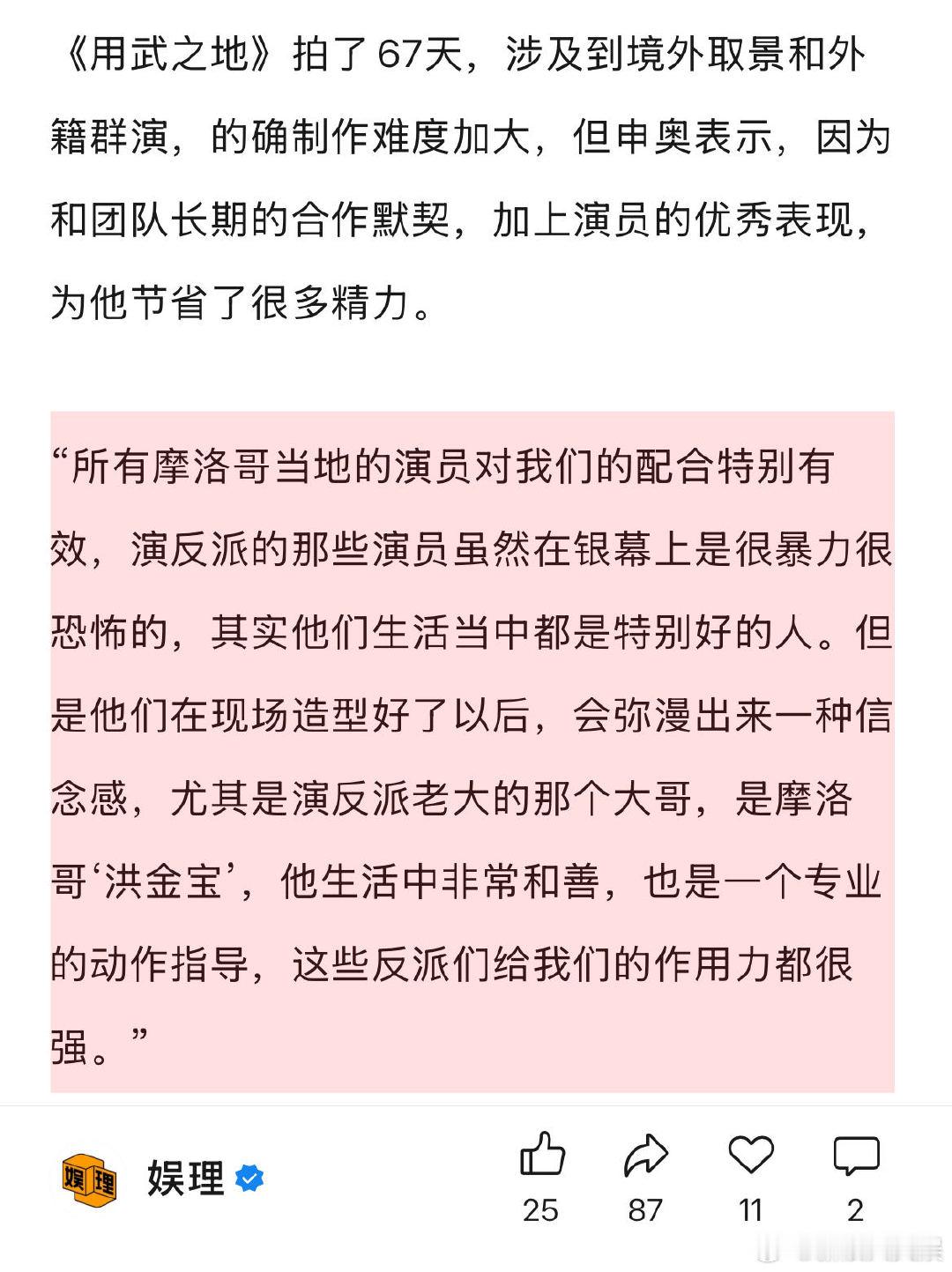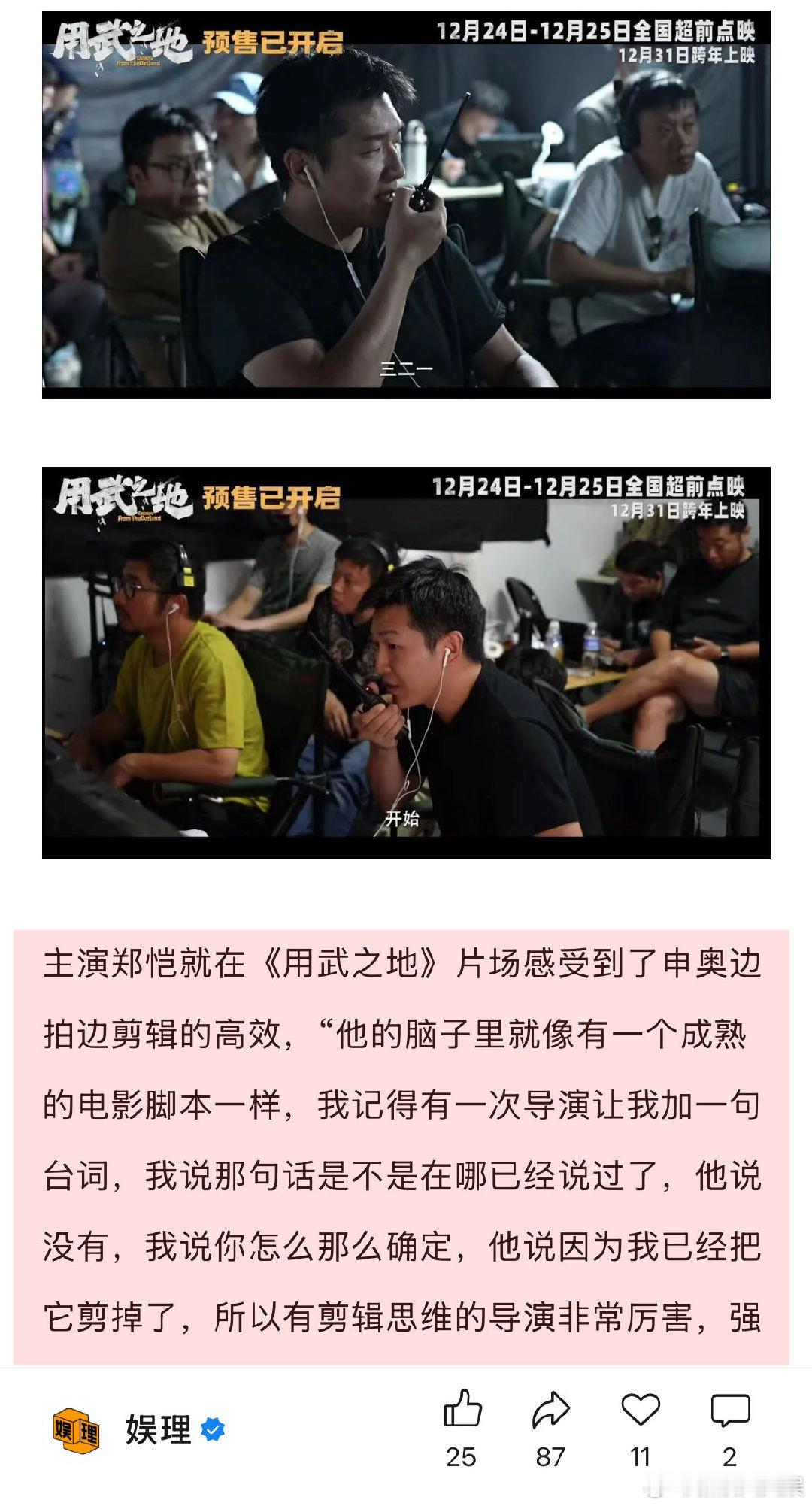 申奥回应高产 郑恺谈踩地雷戏 申奥高效的秘诀在于用剪辑的思维去拍摄电影, “我们剪辑的单位不是一个镜头或者一场戏,而是一帧一帧剪的,用这个思维去创作,我们会知道哪些戏是可以节约成本的,我们主要拍摄地是摩洛哥和宁夏,把当地的村子1:1复制到宁夏,可能有的戏是在摩洛哥拍的,反打的时候就回到了宁夏。”娱理独家↓
