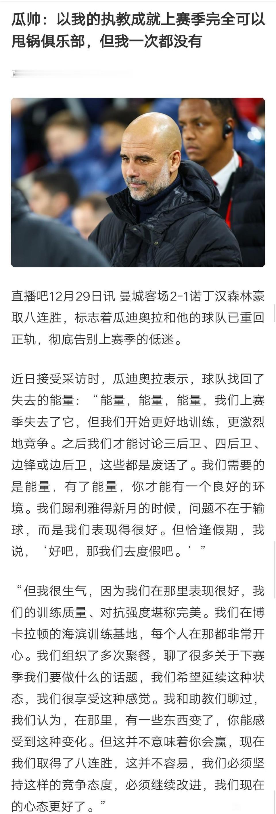 瓜迪奥拉说他上赛季就能甩锅俱乐部,但是他职业生涯从来没有! 他和曼城是互相成就吧,看本赛季能不能夺冠,如果拿到英超确实牛逼。 那就是隔壁阿尔特塔和阿森纳的矛盾。 没拿到冠军,那就不一定了,现在足坛就看成绩,公平合理。[大金牙]