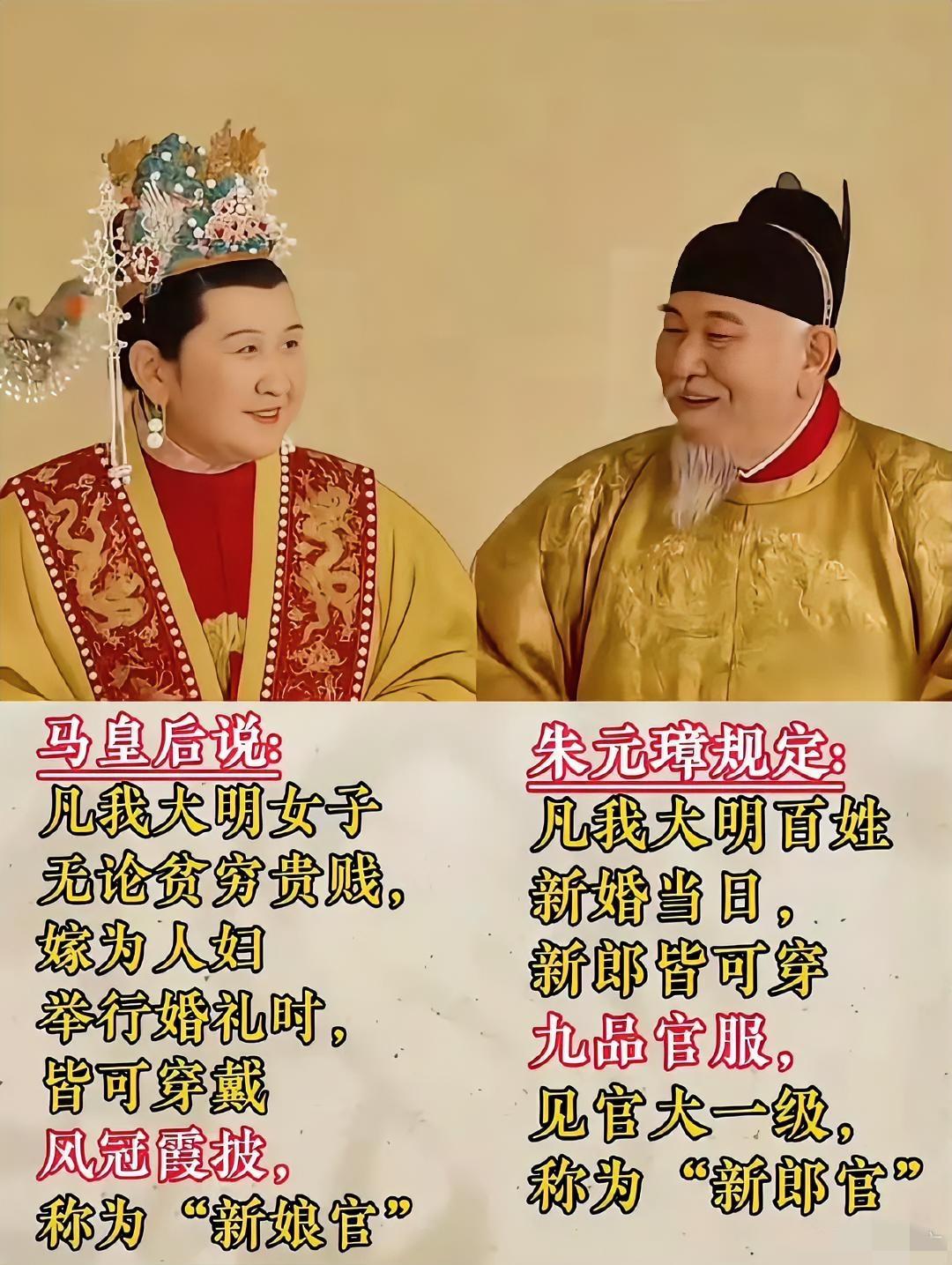 凤冠霞帔的底气:不止是嫁衣,更是马皇后给天下女子的体面 如今办中式婚礼,新娘一身凤冠霞帔盖着红盖头出阁,成了不少人的心头好。有人说这是跟风复古,却少有人知道,这身惊艳的行头,不是什么天生就有的规矩,是明朝马皇后,硬生生为天下女子争来的体面。 很多人分不清汉服和古装,总觉得不过是影视剧里的戏服。其实汉服有个硬标准,叫“上衣下裳”,这才是它的本名“华夏衣冠”的由来,也是为啥只有它能被称作“衣裳”的原因。裳是下裙,衣是上襦,一上一下,勾勒出的不只是服饰形制,更是老祖宗传下来的礼仪和审美。而凤冠霞帔,就是汉服体系里,女子嫁衣的顶配。 但在马皇后之前,凤冠霞帔可不是谁都能穿的。在那个等级森严的年代,龙凤纹样是皇家专属,霞帔这种绣满云霞的披肩,更是宫廷命妇的特权。寻常百姓家的女儿出嫁,顶多穿身红布衣裳,连像样的装饰都不敢乱用。马皇后不一样,她虽是皇后,却打小在民间长大,见惯了寻常女子出嫁时的寒酸。她深知,一身得体的嫁衣,对一个女人来说,是一辈子的念想,是婆家的尊重,更是自己的底气。 于是她力排众议,打破了等级限制。她下旨说,民间女子出嫁之日,可以同公主一样,穿戴凤冠霞帔。这道旨意,在当时不亚于一场小小的革命。要知道,在那个“君君臣臣父父子子”的时代,僭越礼制是大罪。但马皇后偏要这么做,她要的不是形式上的平等,而是给天下女子一个仪式感,一份被看见的尊严。从那以后,凤冠霞帔才真正走进了民间,成了中式嫁衣的代名词。 后来的几百年里,这身衣裳见证了无数女子的人生大事。红盖头一掀,是新的生活,也是老祖宗传下来的温暖。直到现在,我们再提凤冠霞帔,再讲汉服出阁盖红盖头的规矩,不只是在追复古的潮流,更是在记着马皇后当年的那份心意。 现在有人穿汉服办婚礼,总有人挑刺说不够正宗,说形制不对。其实没必要纠结那么多。汉服的魂,从来不是死板的规矩,而是那份藏在衣裳里的文化底气。就像马皇后当年打破规矩,不是为了破坏礼法,而是为了让礼法多一点人情味儿。这身凤冠霞帔,穿在身上,是好看,更是告诉所有人:我们的文化,从来都不是冷冰冰的古董,是能穿在身上,能融进日子里的活物。