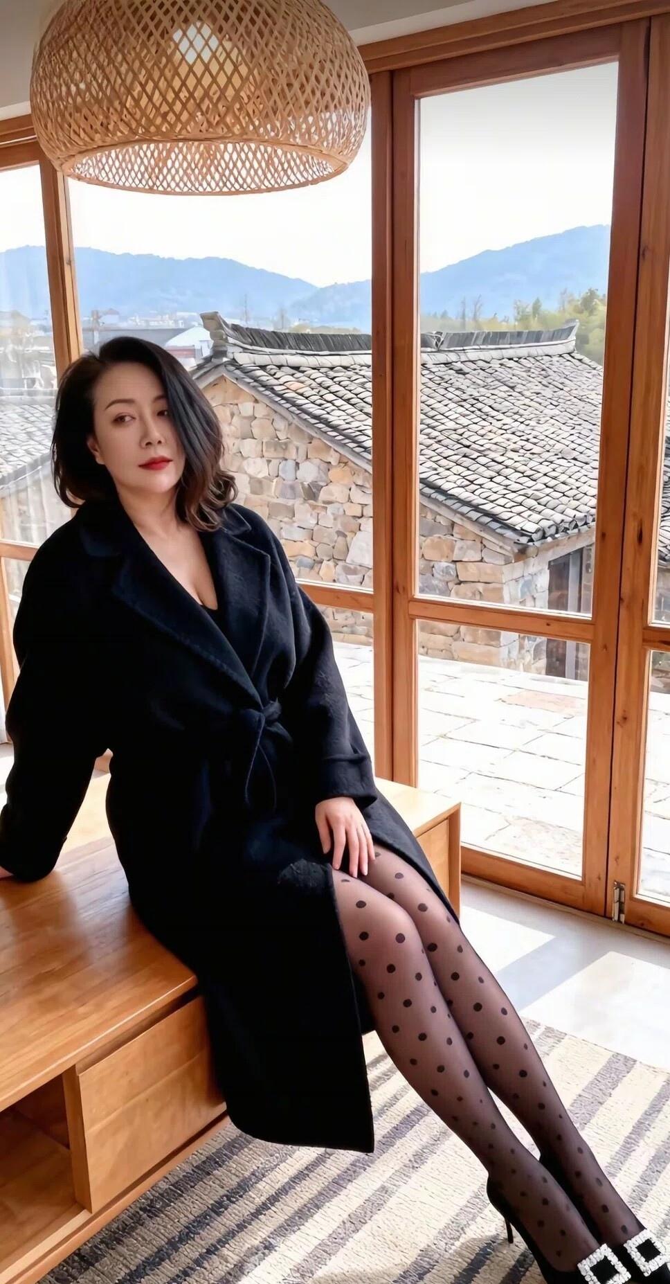 冬日暖阳下的慵懒时光,黑大衣与波点袜的完美搭配,尽显优雅与时尚。