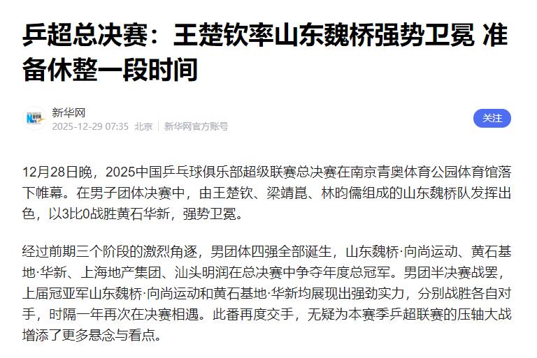 王楚钦想要远离乒乓球? 据媒体12月29日消息,昨天乒超总决赛男团决赛,山东魏桥3-0赢了黄石华新拿了冠军。赛后王楚钦接受采访说,想真正休整一段时间,远离乒乓球和聚光灯。 他还感慨这十年的经历,从懵懂爱打球的小伙子,到现在一步步走来,很庆幸也很开心,希望不跟别人比,只比昨天的自己更好,想安安静静过段私人生活,调整好自己,总结这一年的得失再重新出发。 听完他这话,挺让人心疼的。可能有人觉得,刚拿冠军正是风光的时候,怎么急着休整? 但只要知道他这一年有多拼、压力有多大,就明白这不是一时兴起,更不是退缩,而是个挺明智的选择,毕竟国家运动员的压力,咱们普通人真的很难想象。 先说说他这一年的强度,2025年拿了15个冠军,其中12个是国际比赛的,全年打了近130场球,平均不到3天就有一场比赛,光最后三个月就打了49场。 而且他还得兼顾单打、双打、混双,有时候一天要打三场,刚打完一场就得马不停蹄准备下一场。 之前中国大满贯比赛时,他一天三赛,最后一场打完脸色都白了,接受采访时站都快站不稳了,看着就累。 这么高强度的比赛,身体早就扛不住了。12月中旬的香港比赛,他因为背伤严重只能退赛,热身时上半身都僵了,弯腰都难,最后是教练扶着离场的,第二天回北京就戴上了护腰。 他自己也说,那几天有一两天根本动不了,半决赛前还纠结要不要上,就怕一年两次退赛不好看。 懂点常识的都知道,这种背伤是长期累出来的,要是不及时休息调理,变成慢性伤就麻烦了,可能会影响后续职业生涯。 有教授说过,一年比赛超过30站,运动员受伤概率会高很多,王楚钦光国际比赛就28站,早就超了身体能承受的合理范围。 不光身体累,心里的压力更让人难受。作为世界第一,他一上场大家就盼着他赢,网上全是“必须赢”的声音,这种期待压得人喘不过气。 更有甚者,还说“输球就是不爱国”这种极端的话,天天被这些声音围着,换谁都扛不住。 咱们普通人上班累了还想请假歇几天,何况他要在聚光灯下一场场拼,想远离这些安静过几天普通人的日子,卸卸压力也能理解。 可能有人担心休整会影响状态,其实不用太担心。体育圈里不少运动员都靠休整找回过好状态,比如咱们熟悉的乒坛老将马龙,他职业生涯里也有过累的时候,也主动减少比赛歇过,之后反而状态更好,还拿了双圈大满贯。 羽毛球的林丹也一样,高强度比赛后休整一段时间,回归赛场后表现也不错。反过来,那些硬撑着不休息的,很多都因为伤病提前退役了,这也是不少运动员的前车之鉴。 王楚钦自己也说,想跟昨天的自己比,越来越好。这种休整不是放弃,而是静下心来总结这一年的得失,把好的经验留着,把不足的地方补上,等调整好了再出发。 其实这就跟咱们工作久了要总结反思一样,都是为了之后能做得更好。 说到底,运动员也不是铁打的,累了就需要休息。王楚钦能在拿冠军的巅峰时期主动提出休整,说明他对自己的职业生涯有规划,不只想眼前的输赢,更想走得长远。 对于他的选择,咱们作为观众应该多理解、多支持,别用“必须赢”的枷锁绑着他。毕竟只有让他好好养身体、卸压力,之后才能在赛场上给咱们带来更精彩的比赛。