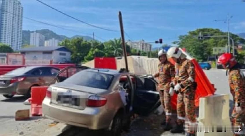 马来西亚一名六旬男子开车途经施工路段时,疑因失控或误闯围起的施工区域,车辆被一支大型铁柱从车底贯穿车顶,司机头部与脸部惨遭重击,当场不幸身亡。