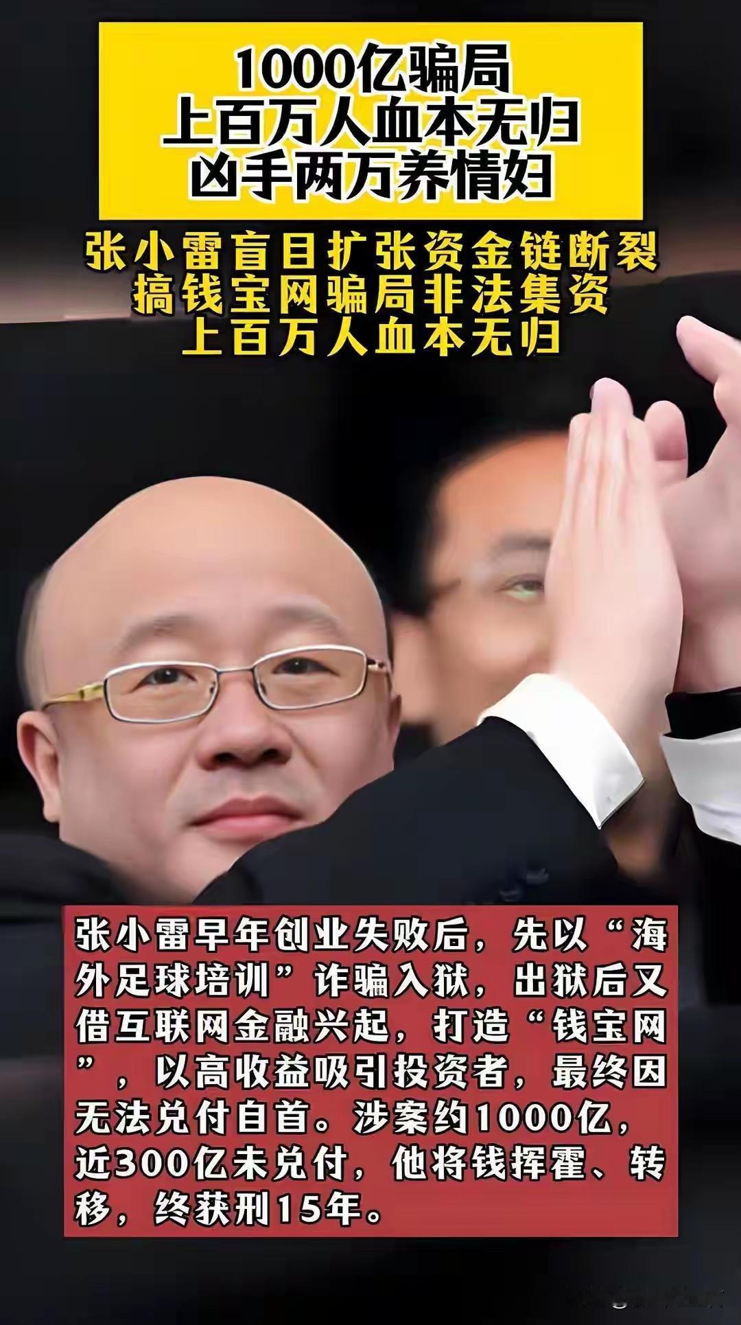 张小雷这事儿,简直是现实版的疯狂闹剧。他才高中学历,2004年就因诈骗判过刑,可还是不长记性。2012年搞出钱宝网,用40% - 60%的高息当诱饵,非法集资1554亿,未兑付本金达300亿。无数投资者血本无归,家庭破碎。 他呢,有妻女还包养4个情妇,给女秘书买6套房,挥霍2亿。2017年投案自首,被判15年,可投资者的损失哪能轻易弥补。2025年11月,财产部分再次开庭,结果还没出来。他这就是满嘴狠词,把投资者坑惨,自己逍遥快活,最后落得这般下场,真是罪有应得。